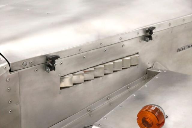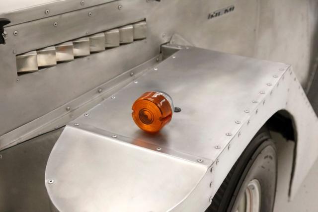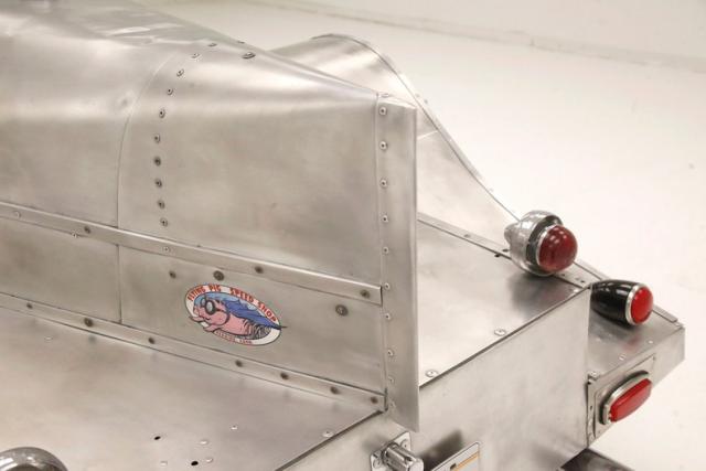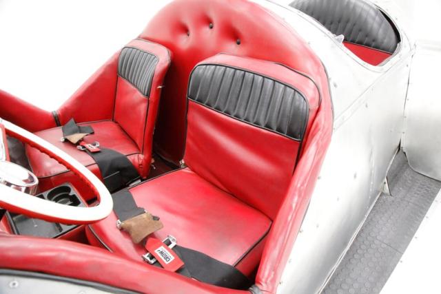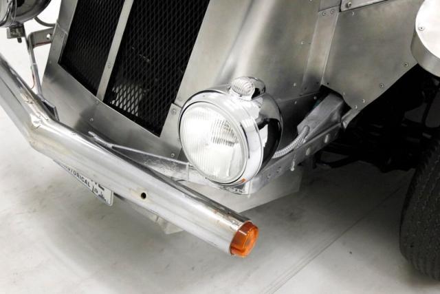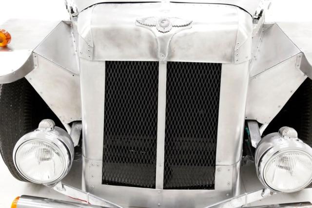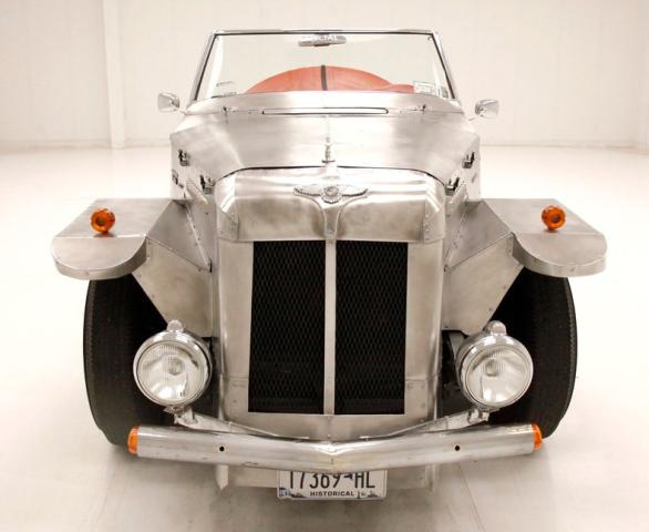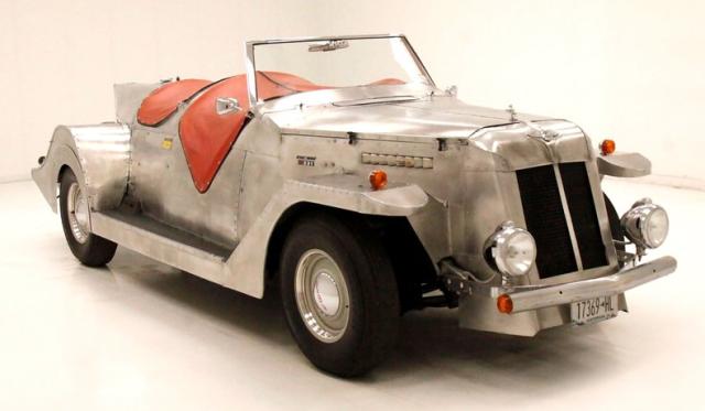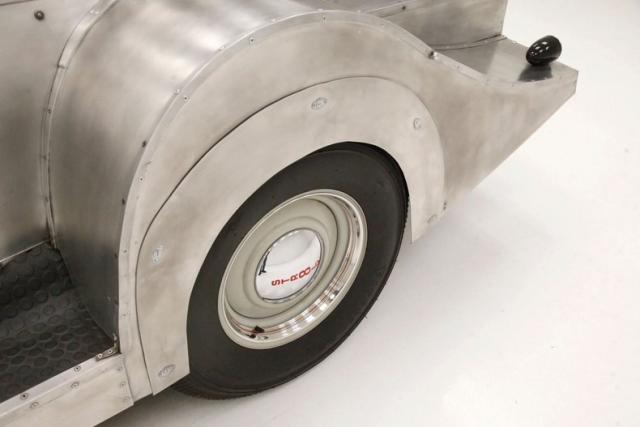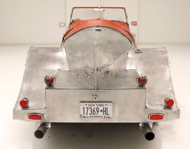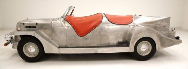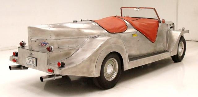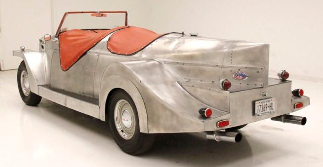 Fashioned from aircraft aluminum, the car is fully custom taking on a look of an amalgamation of many car cues from the past. It has an aluminum radiator surround canted forward, reminiscent of the early cars from the 1920\'s. A single headlight is floating just above a bumper, which has parking lighting on its edges, and said headlights are encased in chromed bullet styled casings. A cowled hood with some side venting and a kneeling winged goddess for a hood ornament are noted. Squared off fenders and running boards are fashioned on either side of the dual opening cockpit body. The back of the car takes on a more curvaceous style with the rear fenders gracefully making a downward plunge and flanking a boat tail back end to this creation. There is an abundance of tail lighting counting not less than 3 sets of tail lights and reflectors from various automotive eras including the 40\'s, 50\'s, and 70\'s reflectors. Large dual exhaust peek out of the back from under the squared off rear roll pan. Deep chromed trim edged wheels sprayed in silver have a badge central moon cap with a Str8ly central red painted badge. All panels are straight rust free and have plenty of riveting holding them to the chassis.