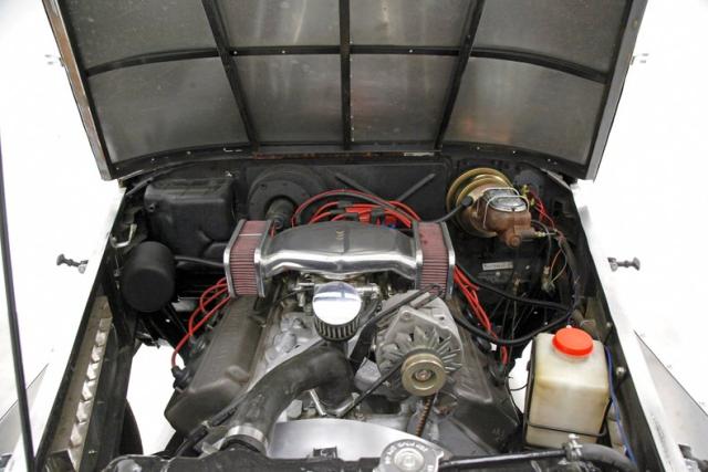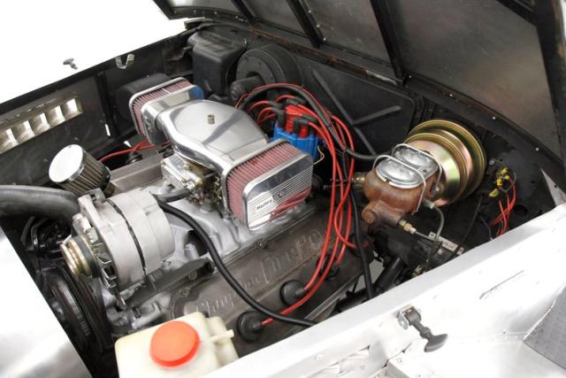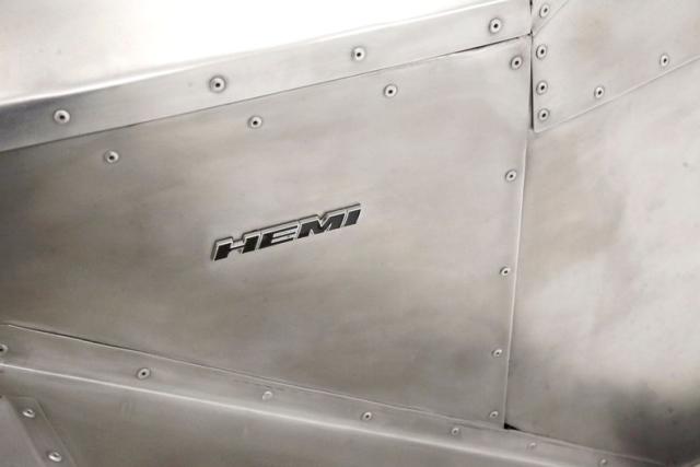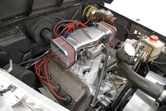 A flip of the standard hood reveals a 331ci Hemi V8. It sports a single Holley 4-barrel carburetor and a 2 speed Powerflite transmission on back. Seen wayyyyy in theback is an 8-3/4 inch rear axle. All is looking good and has industrial gray and silver surfaces for this mill.