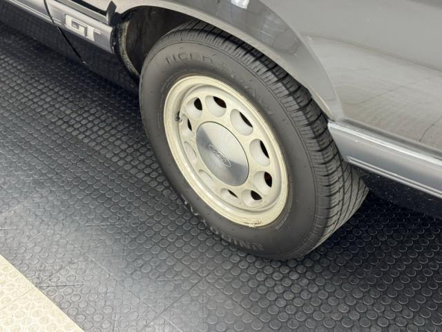 A solid black stallion with features an abbreviated grille integrated into the fascia, flanked by dual headlights over a chin spoiler with fog lights. A wide charcoal stripe on the hood\'s center sets the GT apart as well, along with the 15-inch Ford 10-hole wheels, branded side body molding, and bevel cut dual exhaust out back. It\'s here where you\'ll find a luggage rack on the decklid followed by distinct horizontal tail lights, iterations of which would hang around until 1993. The black canvas soft top is in nice condition and the plastic window is crisp and clear. The piece de resistance of course, is the now legendary 5.0 emblem on the front fenders, worn like a coveted badge of honor back in the day. Imperfections include rock chips up front, a scuff on the bumper, and oxidation of the wheels.