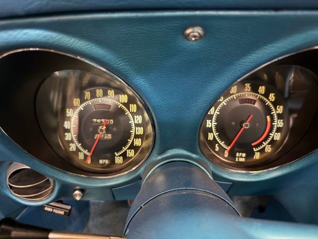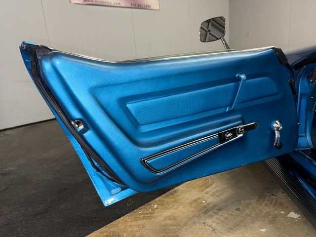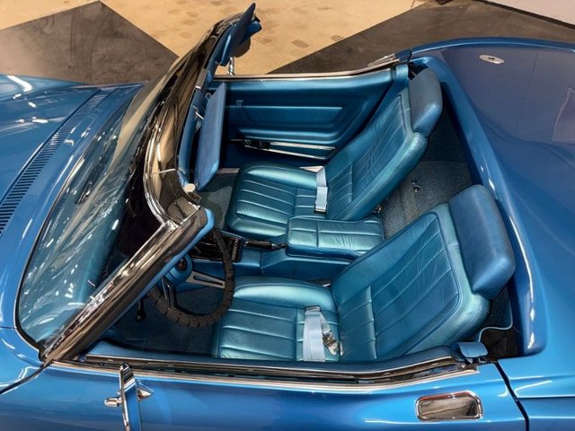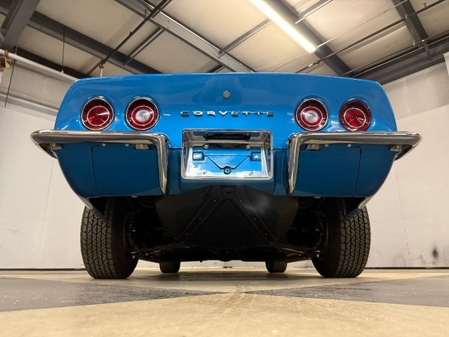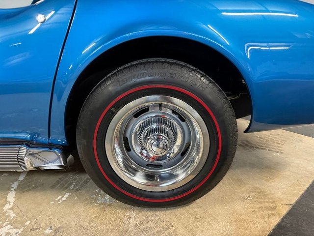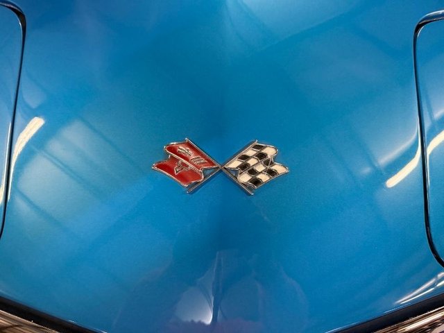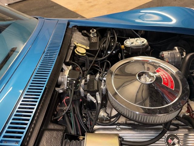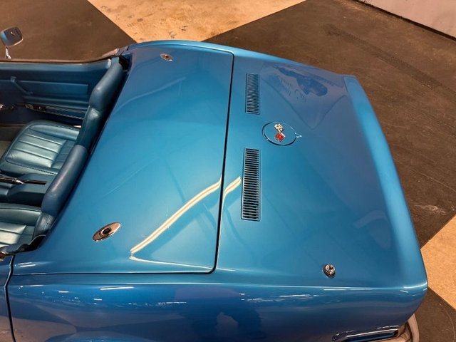 Painted a beautiful Lemans blue this car is slick and straight. The white convertible top is like new. Original type Rally rims, trim rings and center cap with Red line BF Goodrich Silvertown radials like new. Front and rear bumpers like new, hood grill is like new. All emblems are like new, side marker lights are like new. Center grill and side grills like new, lower grill is chrome and like new. Parking lights are like new. Lower front spoiler like new, the tail lights are like new, antenna is like new. License plate frame is like new. Dual outside mirrors like new, windshield trim is like new, outer window seal and stainless garnish moldings for doors like new. Side exhaust covers like new, fender louvers like new. All the glass is like new, all new items, lower control arm bushings. 4-wheel alignment, ball joints upper and lower, leaf spring bushings, leaf spring mount kit. Felpro transmission pan gasket, master cylinder upgraded Wilwood brake calipers. This is a beautiful Corvette, a real head turner.