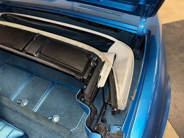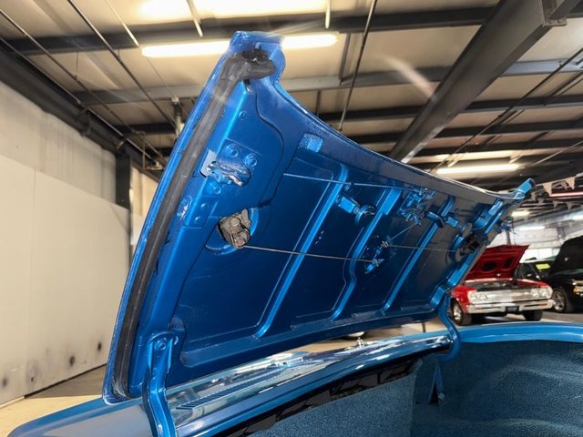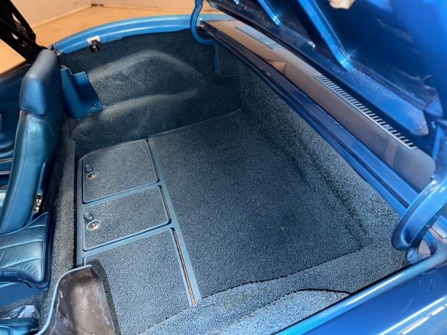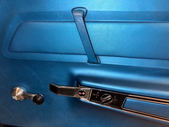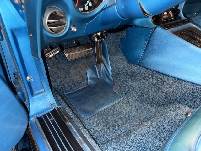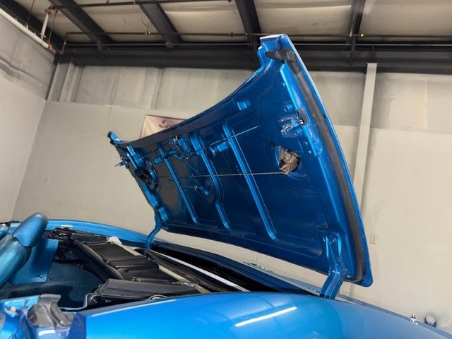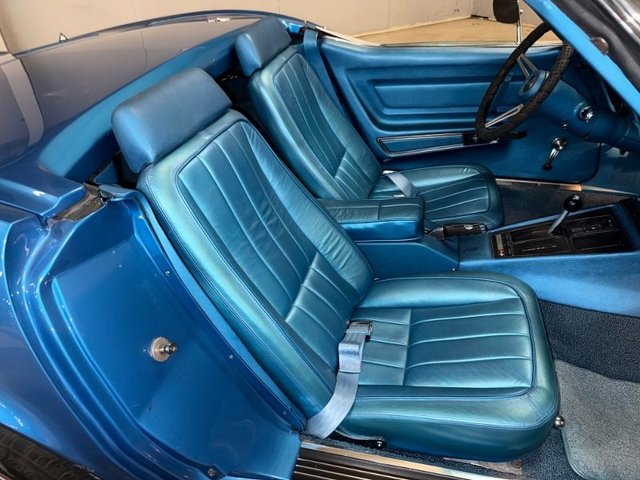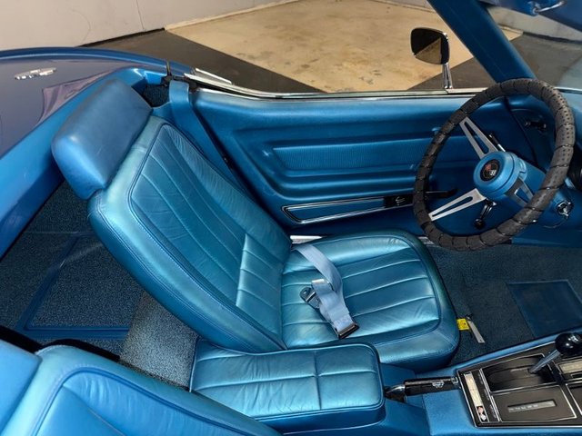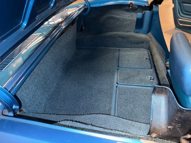 The interior is a beautiful blue on buckets with headrest, automatic in console, center console arm rest with tilt-telescopic column. All factory gauges, aftermarket Corvette logo radio in original spot, factory seat belts, blue carpet, A/C and heat, window cranks and door handles all like new. Door panels and sill plates like new. Looks new inside!