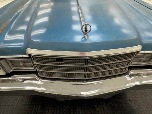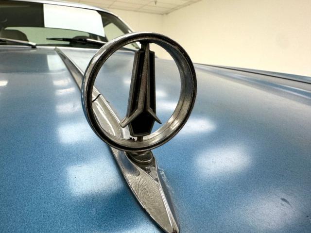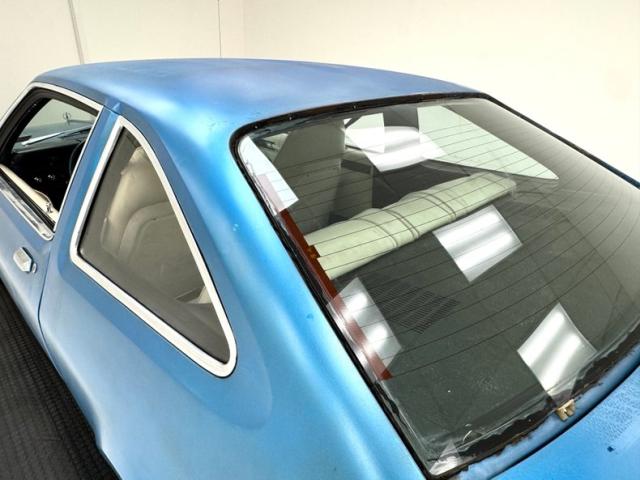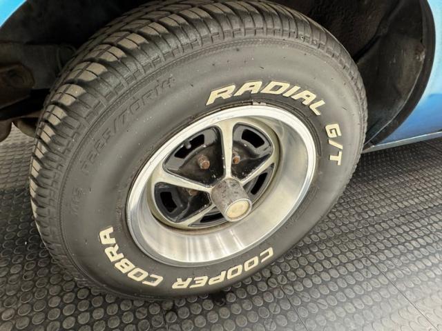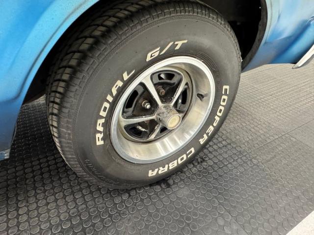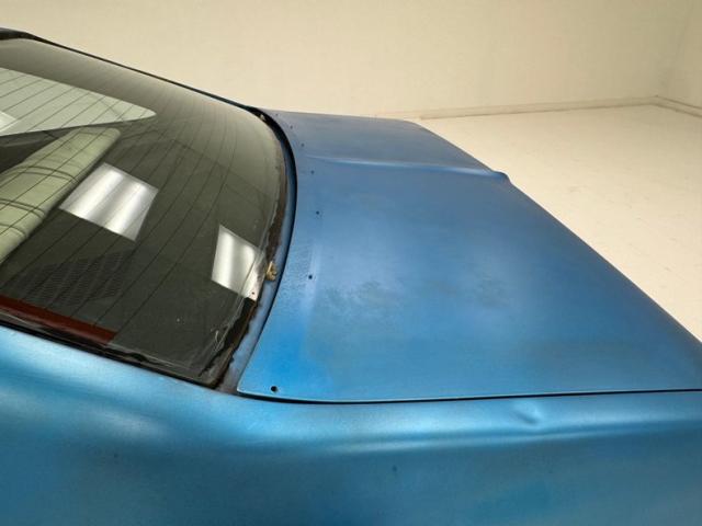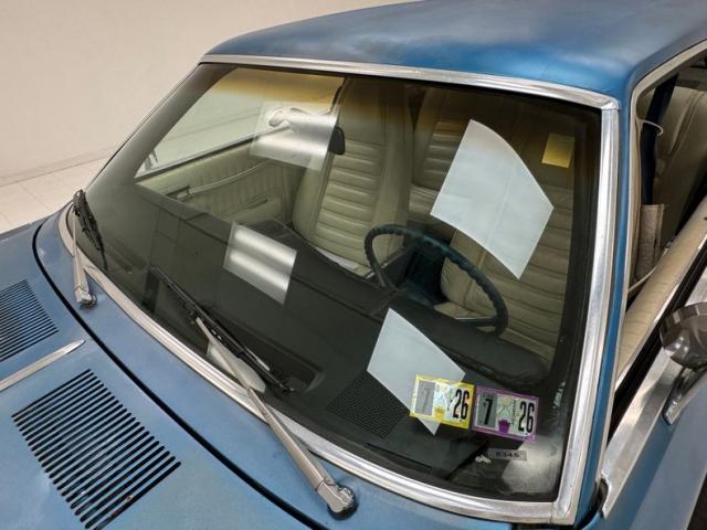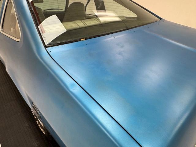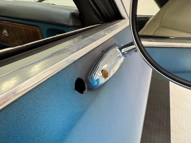 White vinyl is the interior of choice here beginning on door panels accented with simulated wood trim and a center stitch patterned section and both show a touch of patina but the only real damage is a tear in the driver\'s armrest. Inside, tall white bucket seats occupy the front and the driver\'s seat shows some heavy wear while the passenger seat and rear are in remarkably good condition and provide a nice contrast to the otherwise blue interior. This includes the steering wheel, showing some cracks on the rim, and the center console trimmed in woodgrain to match the faceplate of the instrument cluster which houses a simple and handsome array of gauges, controls, and an AM/FM radio, all in decent condition. The dash pad however, has seen better days while the shifter between the seats has held up well over plush blue carpet with low pile loop style on the actual floor, and present with some staining. Our black headliner is decent and showing some sags, contrasted sharply by white visors. The dome light is loose, and the lid on the center console is missing. The trunk has a black mat over metal that is in decent shape.