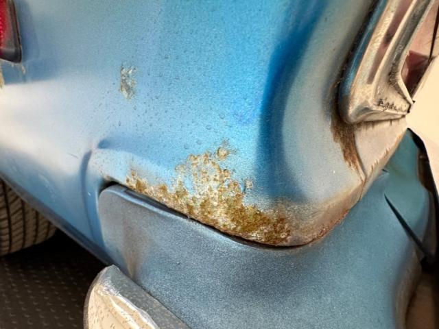 Surface rust that\'s not unexpected is prevalent underneath and there is one spot of flaking rust on a frame rail, but overall it looks solid on this side of the car. A single exhaust travels to a Thrush muffler before exiting out back through a chrome tip. There is no catalytic converter on board. Power disc brakes occupy the front while power drums are out back. The unique suspension Sergio talks about is a transverse torsion bar up front matched with the typical leaf springs in back.
