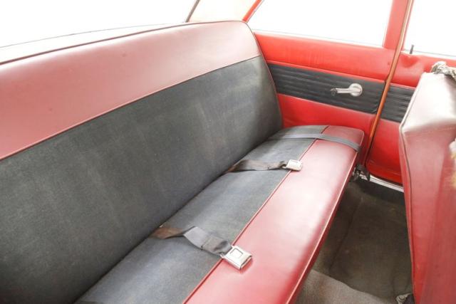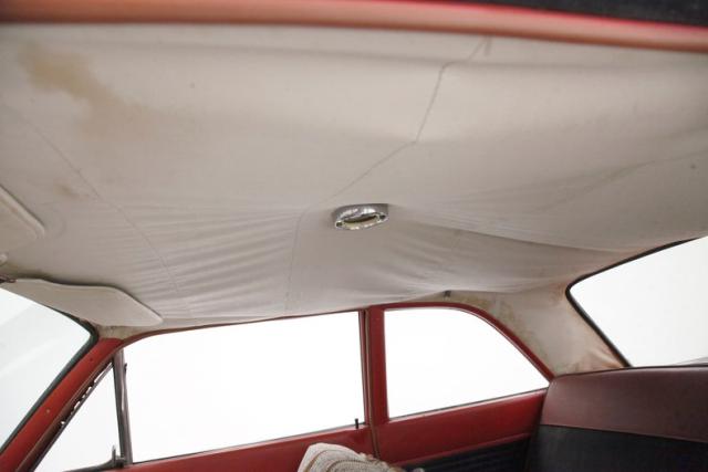 A swing of the doors and we can see the original door panels in red and black, and the vinyl has damage as well as the interior door pulls. The front split bench seat is covered, and it is assumed to be original underneath, but may have damaged covers, however they are in red and black, matching the door panels. The dash is original and shows some corrosion and damage on trim work. A large black plastic wheel fronts the chrome and silver trimmed gauge cluster and in the center of the dash is a Comet badge and the original AM radio. A band of bakelite knobs and pulls dress the bottom of the dash and black ribbed rubber flooring floats this Jet-Age interior. Above, the headliner is sagged and shows with a water staining in areas of the white vinyl.