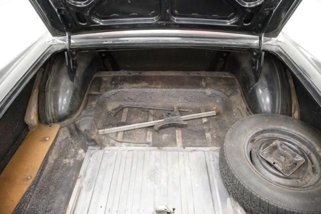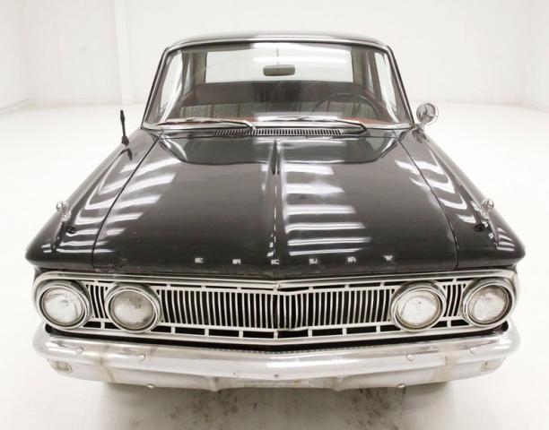 What could possibly be the original Presidential Black paint, we note some dull spotting in the finish along with chip offs, crazing and a few small areas of rust bubbling reserved for the lowers, but again these areas are small. Overall things remain amazingly original with good condition straight steel, all minding their gaps, and staying in line. Opening and closing the doors, this car literally has the Mercedes thud, with no after closing vibrating jiggle sounds, just a cold hard thud...which speaks to fit and finish on this 61 year old car. Noted is a nicely placed chrome trim spear going from fore to aft at the belt line and it attracts attention at just the right places for one\'s eye to follow the early 1960\'s line of this car. Plenty of other chromed trim work around all windows and drip moldings as well as highlighting the B pillar add some dress up. The grille sports a pattern that reminds us of an electric shaver and is flanked by dual headlights and some front fender toppings looking like mini fins. Standard turbine style dog dish wheel covers are wrapped by thin whites in 13-inch format, with good tread showing on all. In keeping up the traditional Mercury look the rear shows the \"Dixie Cup\" taillights and just minor fins protruding above on the rear quarters.