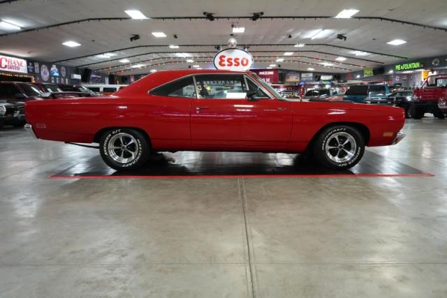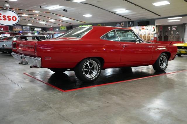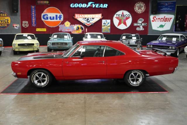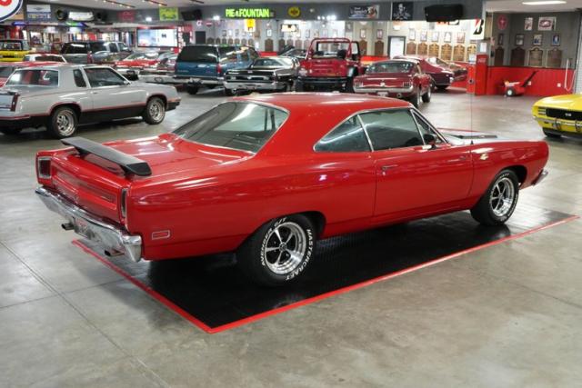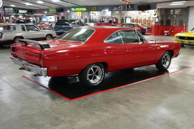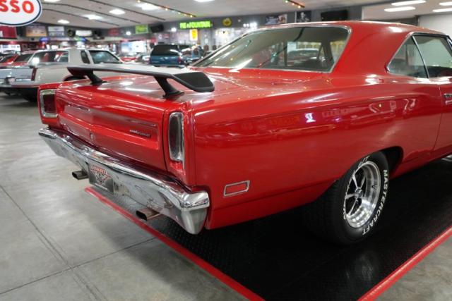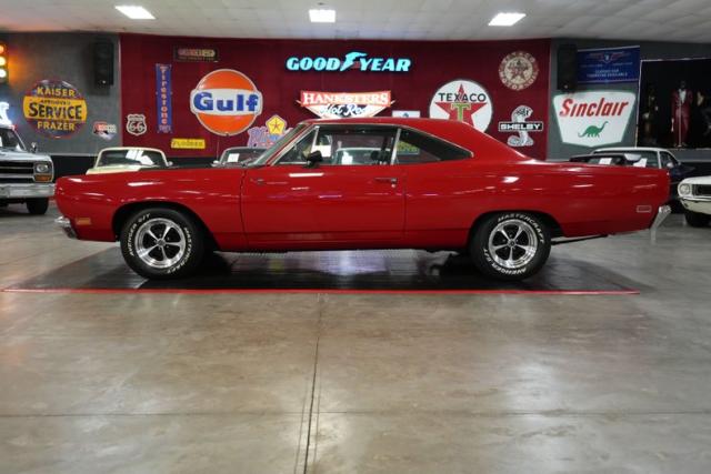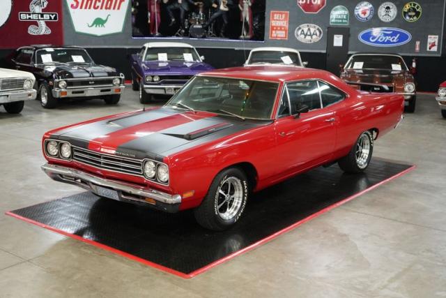 This 1969 Plymouth Roadrunner packs serious muscle with a Chrysler 440 Magnum V8 mated to an A833 4-speed manual transmission. Power is sent to a Chrysler 8 Sure Grip rear end with a 3.55 gear ratio, perfect for spirited street driving. Finished in striking red paint with black stripes, it sits aggressively on 15\" American Racing VN501 wheels wrapped in Mastercraft Avenger G/T tires. The black leather interior adds a touch of vintage cool, while the Holley 4-barrel carburetor, OEM ignition, and belt-driven cooling fan keep it running strong. A true Mopar icon built for performance and classic street presence.