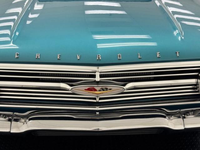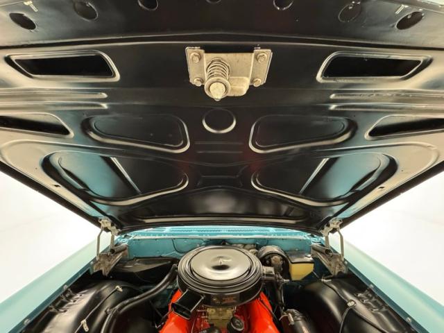 Turquoise and white houndstooth inserts dress up the door panels that include turquoise vinyl panels, polished trim, and a bold red and chrome accent piece and both present cleanly. That houndstooth reappears in the inserts of the split bench seat, framed in vinyl panels and mirrored on the bench seating in back, and all are show quality. Talk about a show, the bright blue steering wheel with the boomerang horn ring fronts a dash that layers shiny turquoise around five gauges and perforated stainless steel around the knobs in the mid dash. There\'s an AM radio on board and Impala rubber mats protect the looped turquoise carpet below, both in great shape. The angled shaft of the shifter results in the ball knob reaching the driver at the perfect position as it rises from the floor. The trunk is pristine looking with a vinyl mat covering wall to wall and a matching white wall tire spare secured to the floor with a stock style jack.