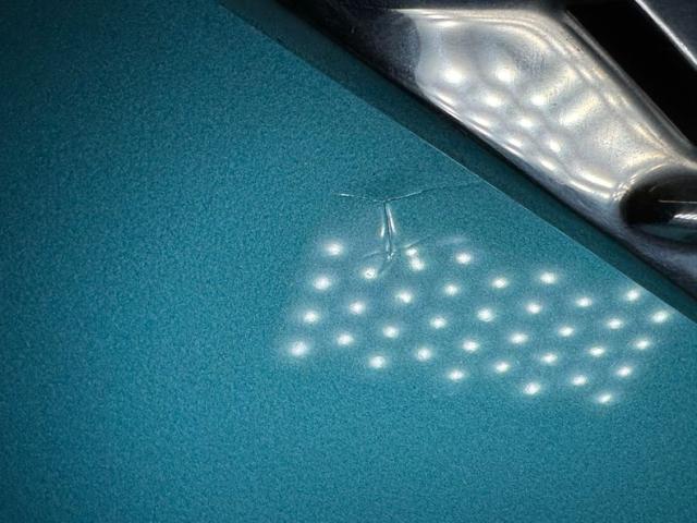 Spectacular two stage Tasco Turquoise is contrasted by the white canvas top and on the contrail of the fantastic jet shaped trim on the side, pointed forward and leaving a white stripe that stretches to the back. Turn that corner, and we find the triple tail light configuration with the center reverse light sandwiched between red, cone shaped lights. Polished trim on the end of the horizontal fins accentuates them and breaks the long stretch of red that comes from the decklid, flanked by rearward canted antennae and from this angle we would not be surprised if this car could fly. The open cabin is fronted by a sharply curved front windshield while a quartet of trim ornamentation dressed the front fenders. 14-inch wheels are colored keyed and wear the proper covers, partially obscured in back of course, by the fender skirts. Overall, the paint, polished trim, chrome bumpers, and white top are in great condition. Imperfections include a few areas of cracked paint, minor bubbling, and a ding in the taillight trim.
