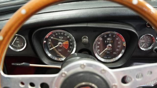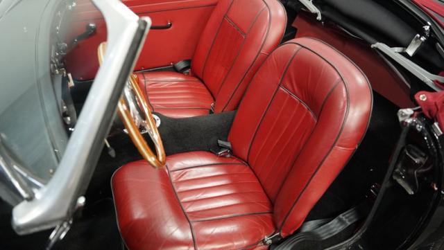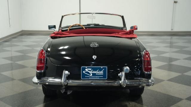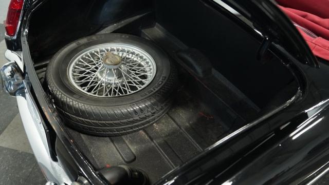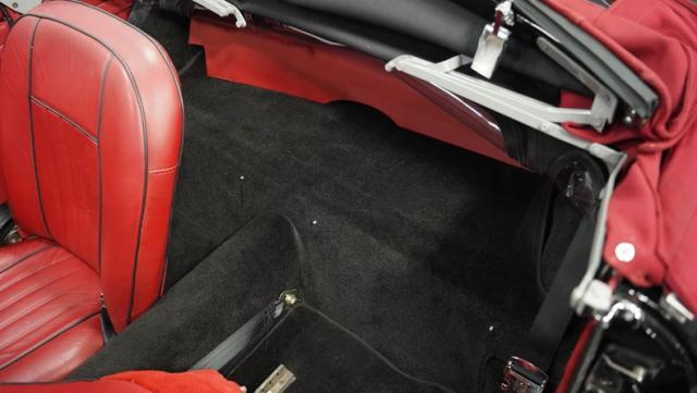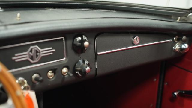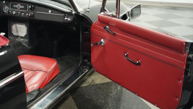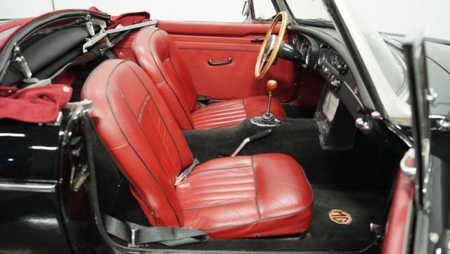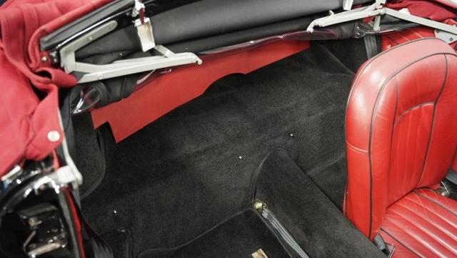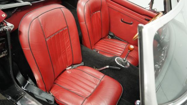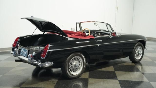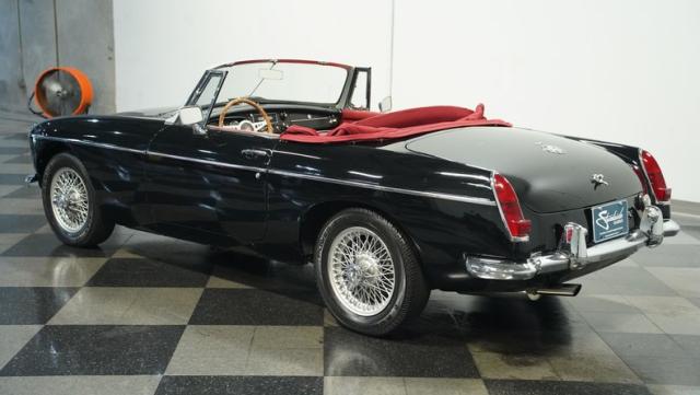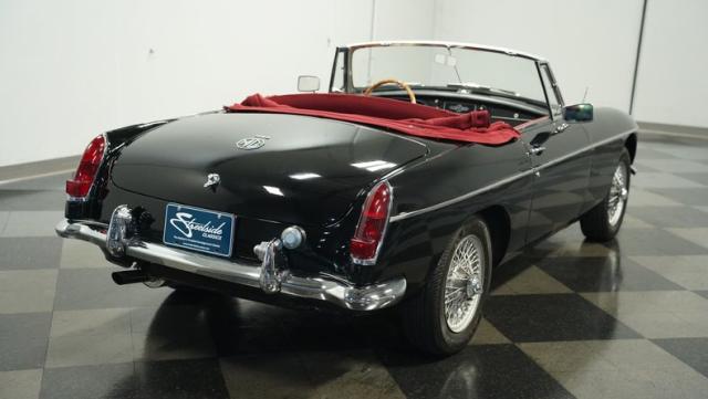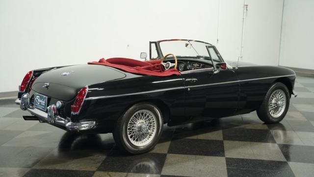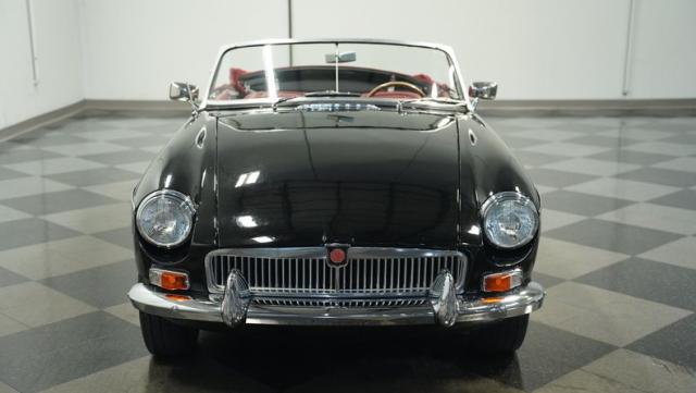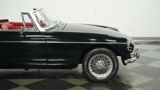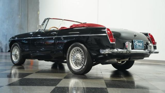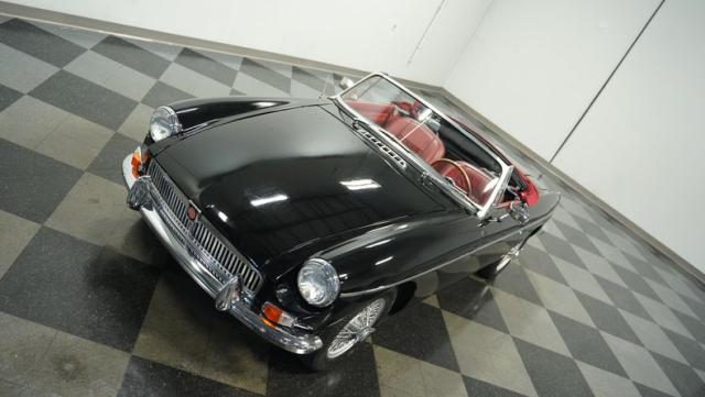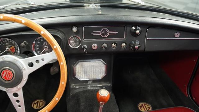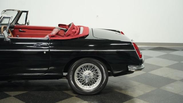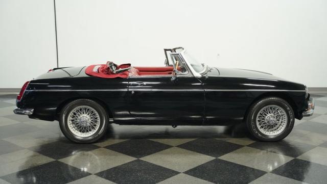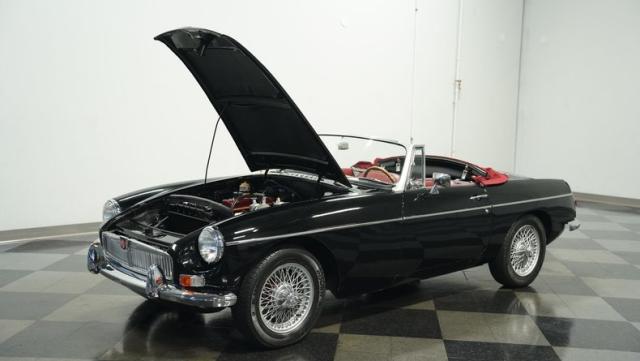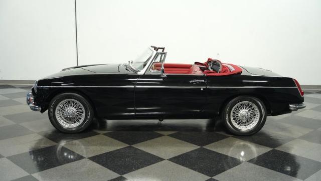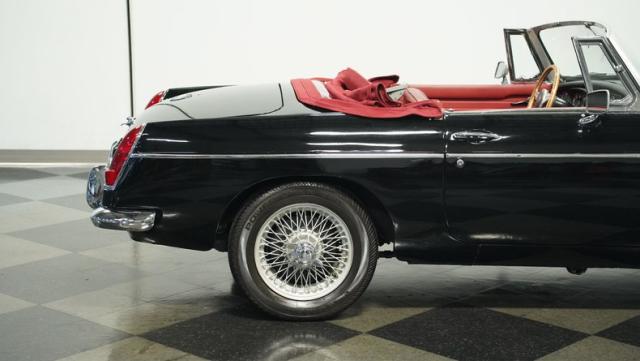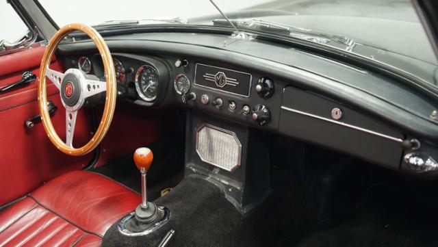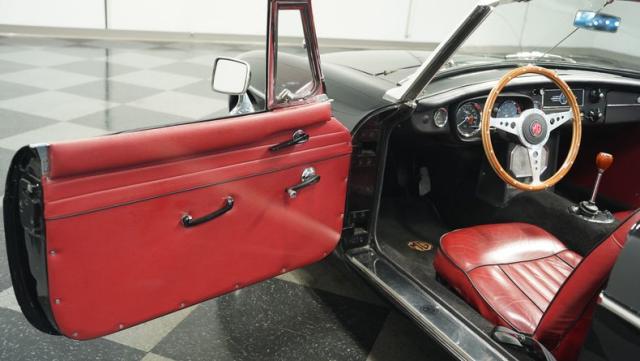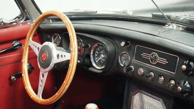 Open the door to reveal a vibrant red leather interior. The cockpit is pure driver-focused simplicity. Crisp Smiths gauges and toggle switches adorn the dash, while bucket seats keep you planted during spirited driving. A floor-mounted shifter puts the 4-speed manual at your fingertips. The burgundy cloth top, when lowered, transforms this MGB into the quintessential open-air British roadster.