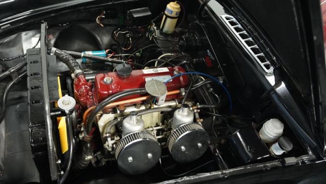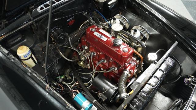 The 1798cc inline-four engine is the beating heart of this MGB. Twin SU carburetors feed the powerplant, which drives the rear wheels through the manual gearbox. Front disc brakes provide confident stopping power, while the coil spring front and leaf spring rear suspension deliver nimble handling. An aftermarket muffler gives voice to the exhaust, creating a fitting soundtrack for back road adventures.