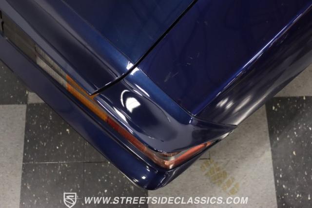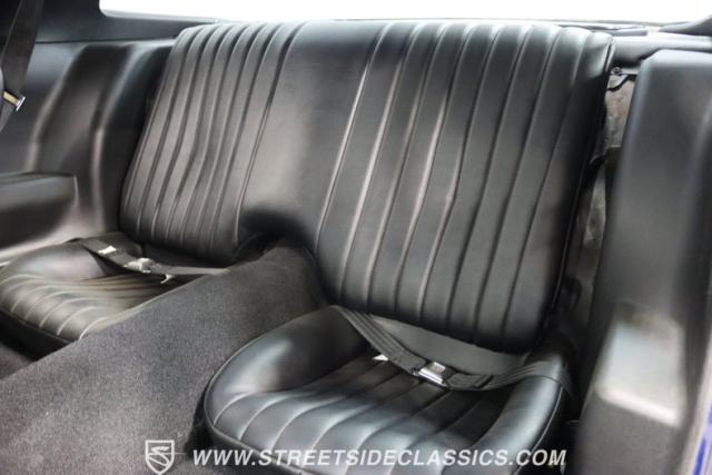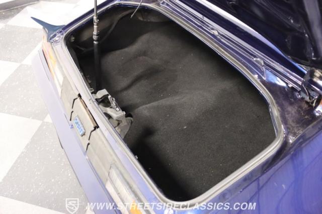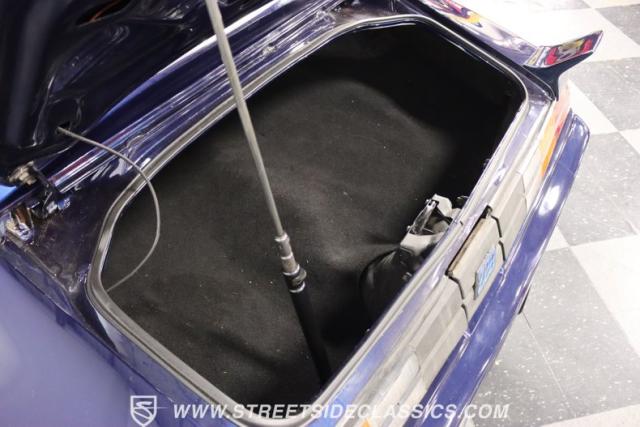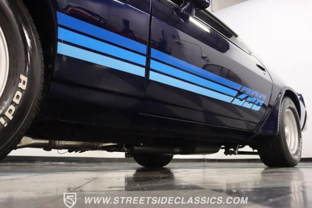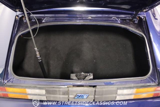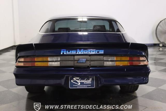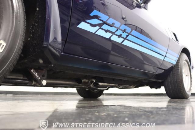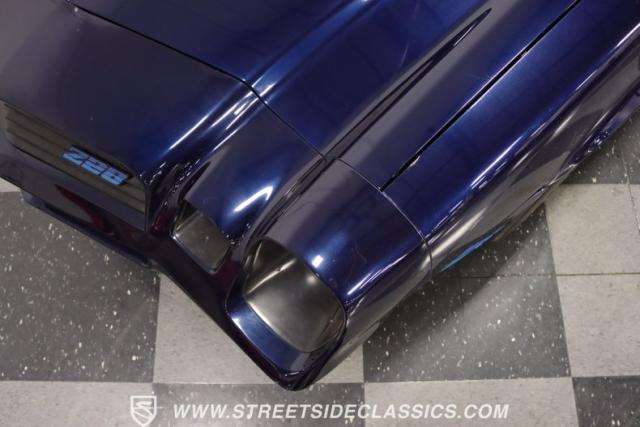 There\'s a mean style that comes on a car with such a dark blue that it almost looks black in some lights. And the triple-blue stripe package is a well-coordinated piece for this total package. It sets the tone right for a proper Z/28. Plus, you have the right details, like the chin spoiler that wraps around to the wheel openings, a proper power dome hood, fender vents, and the three-piece spoiler out back. The overall look of the finish is glossy and fun for a driver-quality car. You may want to do some updating on your own time or remove the custom graphics under the rear spoiler. But the reason why there\'s so much overall appeal is that when you take the time to be thoughtful about a car like this, there are some awesome custom details, too. For example, you\'re going to love taking this to a nighttime cruise-in because you not only have LED halo headlights, but also the cowl hood has a cool blue glow that coordinates with the car\'s color theme.