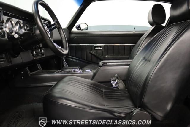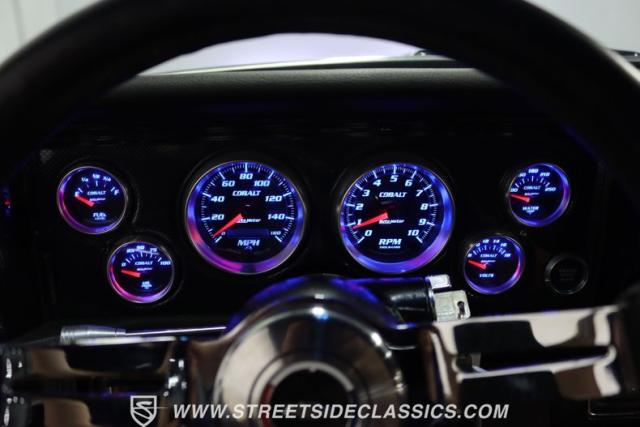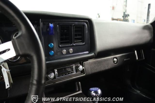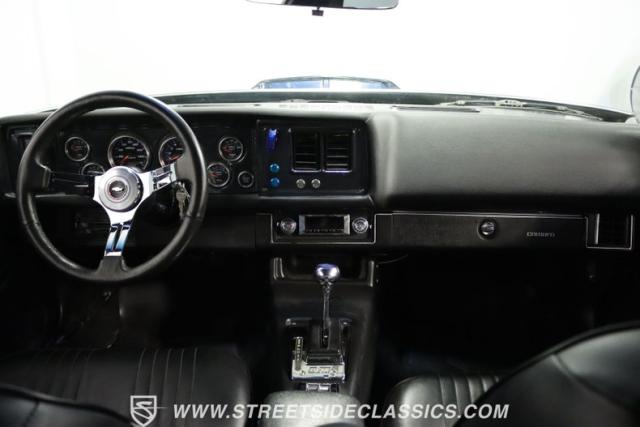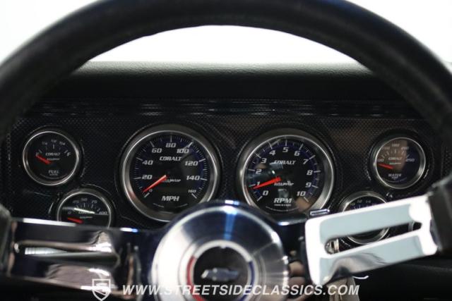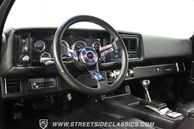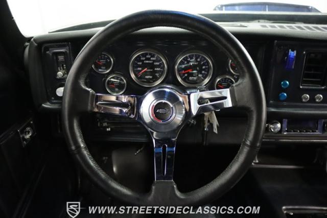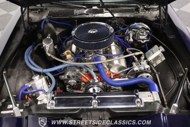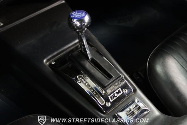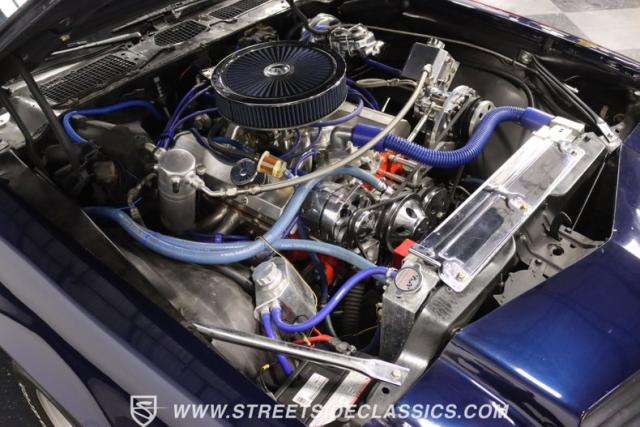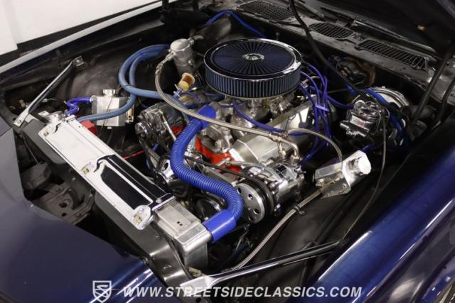 The moment you open the hood, you can tell the motor is far from stock. It has the bright and clean look of thoughtful investments. And while polished pieces are often there to impress, this one has the elements like the fabricated valve covers, upgraded pulleys, and a large aluminum radiator that tell you the shiny pieces also have substance. At the center is a freshly installed 350 cubic-inch V8. It has been enhanced with an Edelbrock fuel pump, an Assault Racing dual plane aluminum intake, and topped with an Edelbrock AVS2 four-barrel carburetor. Headers add power while contributing to the rumble of the dual exhaust, and any time you really want to bring the thunder, this has electric cutouts. It\'s a powerful car, and so it has a beefed-up TH350 three-speed automatic transmission feeding a 3.73 rear end with Richmond gears and Positraction. As you look underneath, you\'ll spot some nice rear upgrades like the thick sway bar and Caltracs traction bars. And there\'s also power steering, power brakes, front discs, and a nice set of BF Goodrich T/As on shining Torq Thrust wheels.