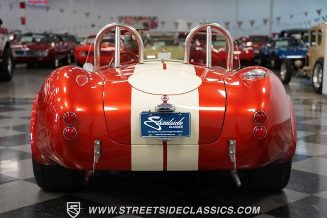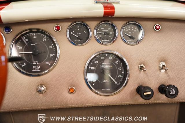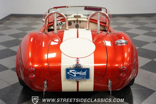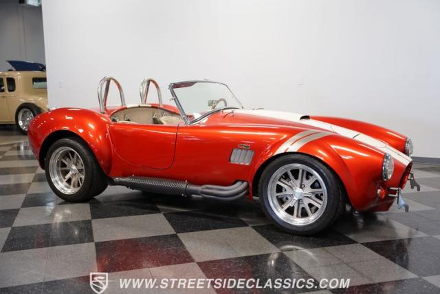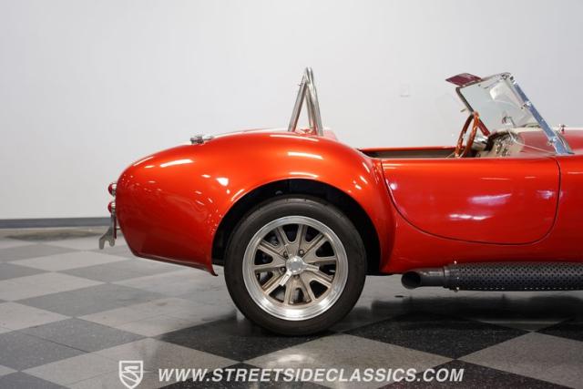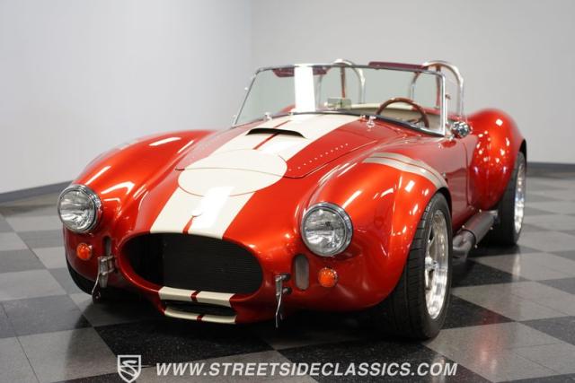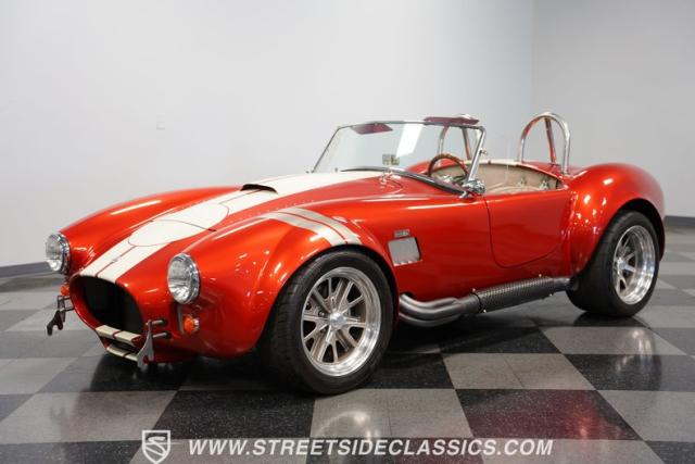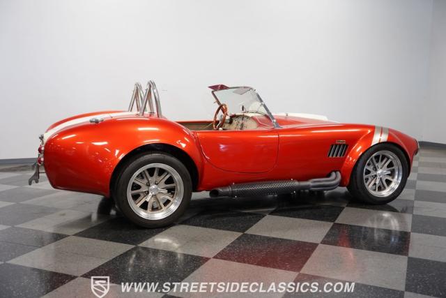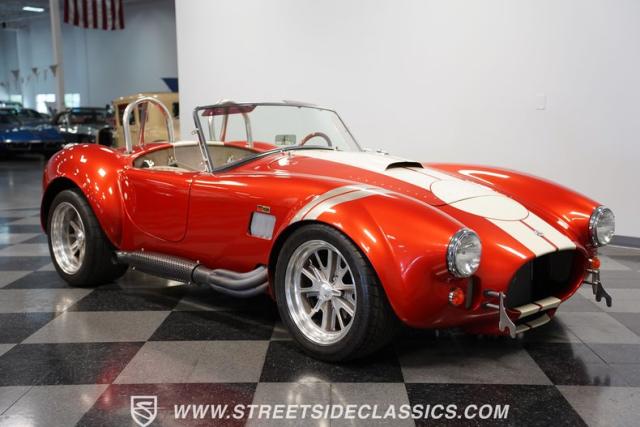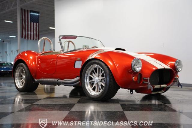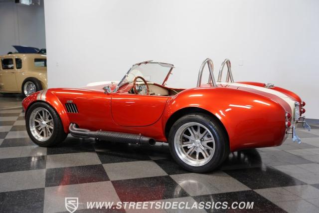 This 1965 Shelby Cobra is a bolt of orange lightning channeling the spirit of Ken Miles with its blend of vintage racer and modern street machine. With a stunning copper paint job accented by cream and silver stripes, fat tires tucked under those bulging fenders, and dual roll bars, this backdraft has a look of its own. The perfect finishing touches are those simulated knock-off wheels and the billet gas cap. It\'s a Cobra that stands out from the crowd and will grab some attention in the following cars and coffee!