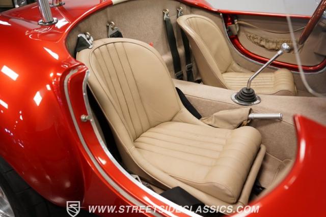 Slip inside, and the tan leather seats beg you to go for a cruise. Settle into the buckets with their racing harnesses holding you snug, wrap your hand around that floor shifter (angled just right, like a real Cobra should be!), and fire it up. The Speedo might be reversed for a little race-day flair, but otherwise, it\'s a pure, comfortable sports car here. Keep an eye out for the fuel pump and fan switches tucked away just a quick flick puts everything at your fingertips. Besides the visceral sounds and experience of being in a street-legal, track-devouring nod to a legendary car, you\'ll notice you have a little more legroom than other Cobra experienced. This one has an extended chassis, allowing taller individuals to experience the greatness these cars can offer comfortably.