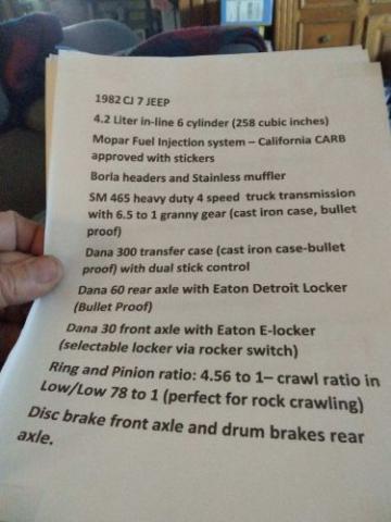 1982 Jeep CJ7 4.2 liter in-line 6 cylinder (258 cubic in) Mopar Fuel injection system- California CARB approved with stickers Borla headers and stainless muffler SM 465 heavy duty 4 speed truck transmission with 6.5 to 1 granny gear (cast iron case, bullet proof) Dana 300 transfer case (cast iron case- bullet proof) with dual stick control Dana 600 rear axle with Eaton detroit locker (Bullet Proof) Dana 300 front axle with Eaton E-locker (selectable rocker via rocker switch) Ring and pinion ratio: 4.56 to 1-crawl ratio in Low/Low 78 to 1 (perfect for rock crawling) Disc brake front axle and drum brakes rear axle Please Note The Following **Vehicle Location is at our clients home and Not In Cadillac, Michigan. **We do have a showroom with about 25 cars that is by appointment only **Please Call First and talk to one of our reps at 231-468-2809 EXT 1 ** FREE Consignment Visit Our Site Today Easy To List Your Vehicle and Get it Sold in Record Time.