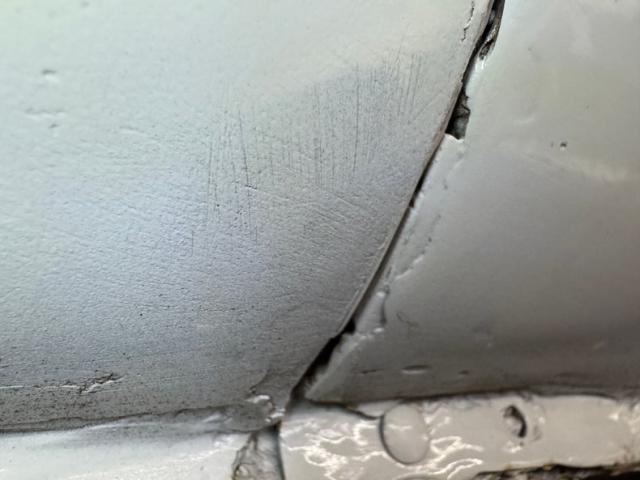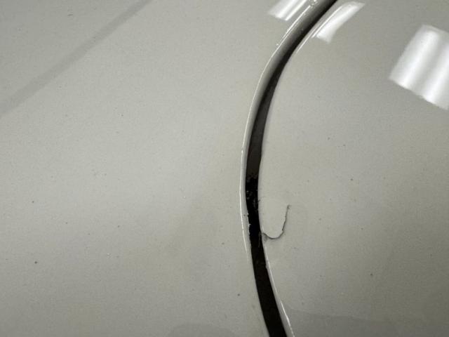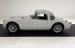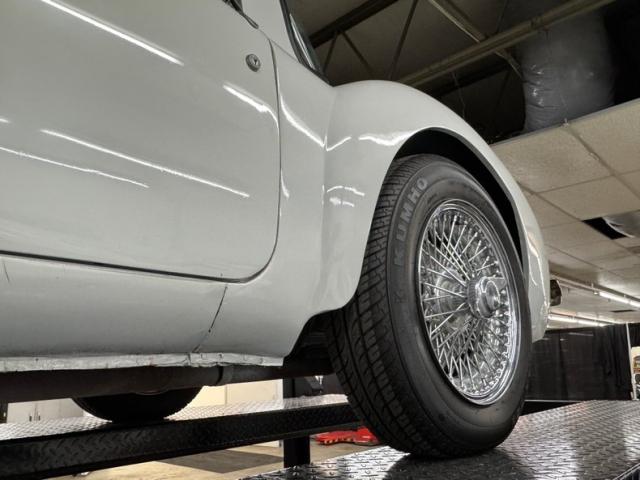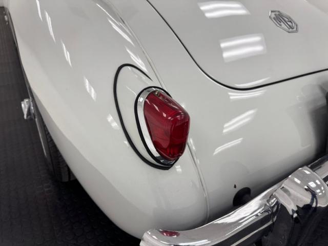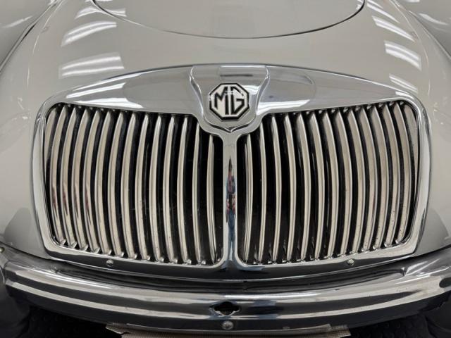 The MG presents in classic British sports car profile, the dramatic shape that was the coveted ambition of many Americans after World War II and beyond. This coupe has a rounded roofline to complement the long nose, sweeping front fender, and abbreviated tail, all covered in Dove Gray. Polished metal trim adds to its elegance with light rings, a windblown grille, and bumpers that flank 15-inch chrome wire wheels with knock offs and 80 series tires. The rear window curves energetically, narrowing the B-pillar behind an already slender A-pillar. The gray is interrupted in the back by a pair of modest tail lights and the infamous octagon MG emblem. Imperfections include some visible filler in a door seam, cracking paint on top surfaces, more evident filler on rocker panels, fender, and apron, light metal pitting, along with various paint chips.