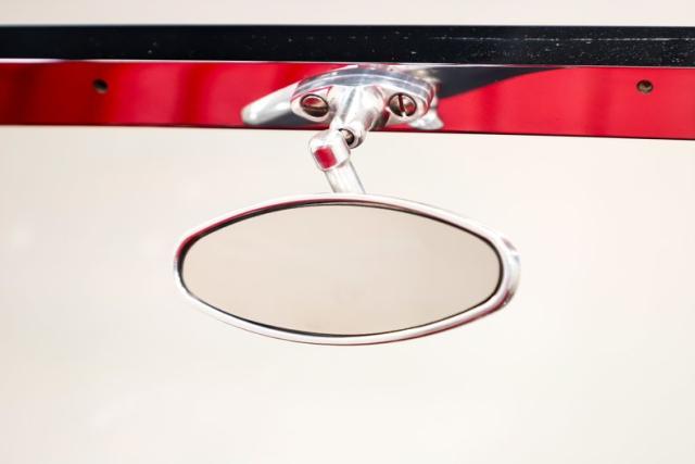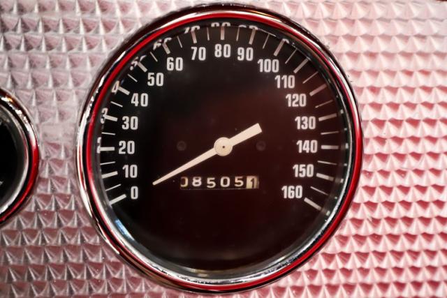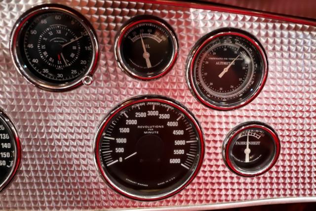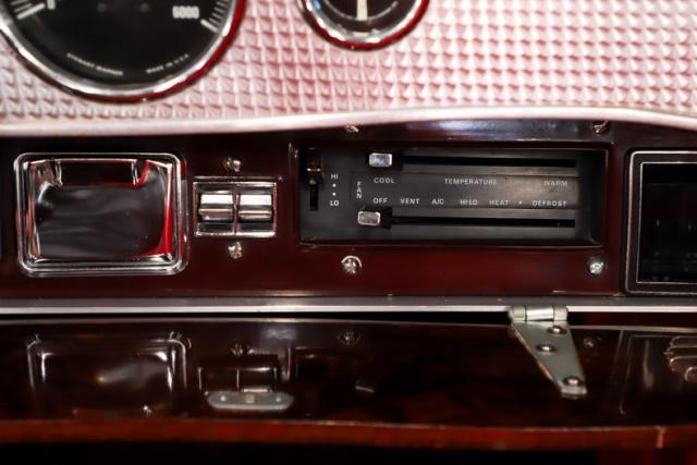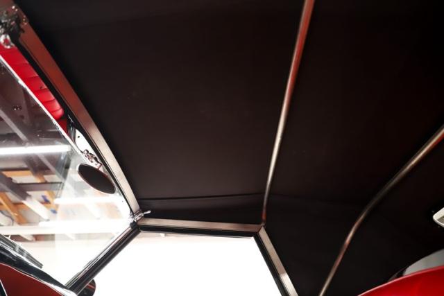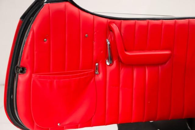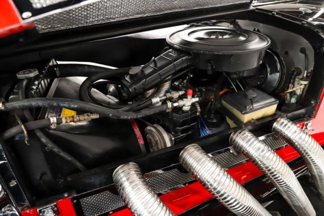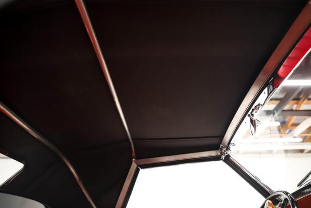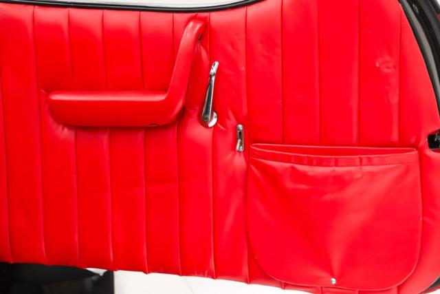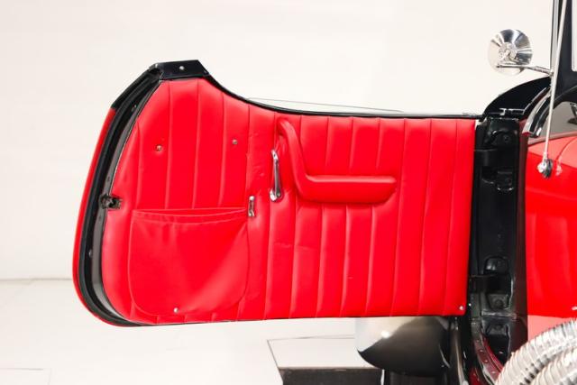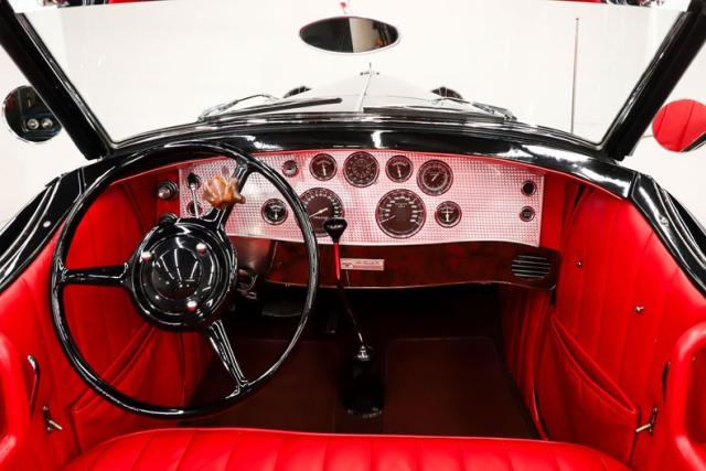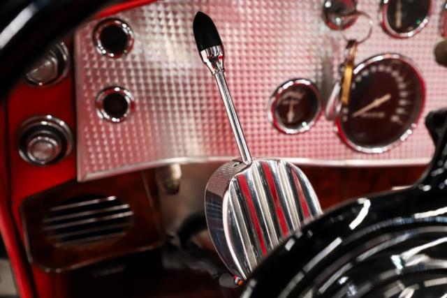 INTERIOR: The red pops! It\'s the same red as the exterior. The seat and door panels are genuine leather. Authentic dash with machine turned panel, a full set of instrumentation including an altimeter, beveled glass lenses. Below the dash a wood panel cleverly conceals the modern amenities such as the stereo, heater controls and power windows. This one has been upgraded with an authentic style steering wheel. Down on the floor is dark red carpet and an automatic shifter that looks like the original 3-speed manual.