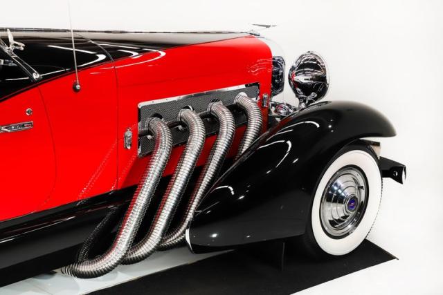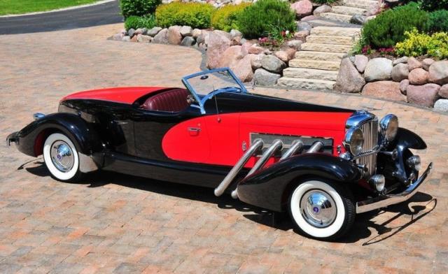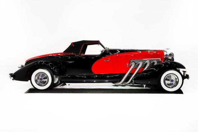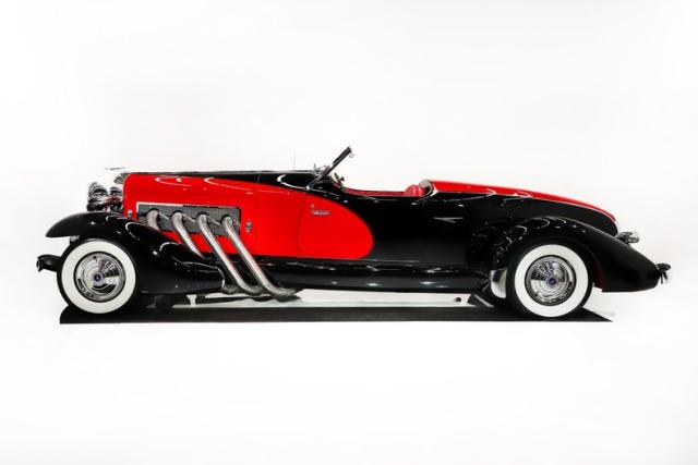 EXTERIOR: Modeled after the 1933 SJ Speedster, one of the fastest production cars of that era. It\'s only fitting that it looks the part too! Its size is impressive, yet it still looks fast sitting still! The long hood has supercharger pipes flanking each side, the boattail back end and the four boattail fenders effortlessly slice through the air. It is made of a sturdy fiberglass with a steel frame. The body is in excellent shape. The paint presents beautifully, onlookers will be in awe. Although there are touch ups and blemishes from age. The black and red is a stunning combination, under the fenders are even painted red. The chrome lights, grill and medallions are authentic. The convertible top is a rich black cloth with red piping. Of all the models this one is the most all weather friendly, the top folds easily and the windows are power. In an era of spoke wheels, even the smooth hubcaps look aerodynamic. The authentic wrapped in whitewall tires are the finishing touch.