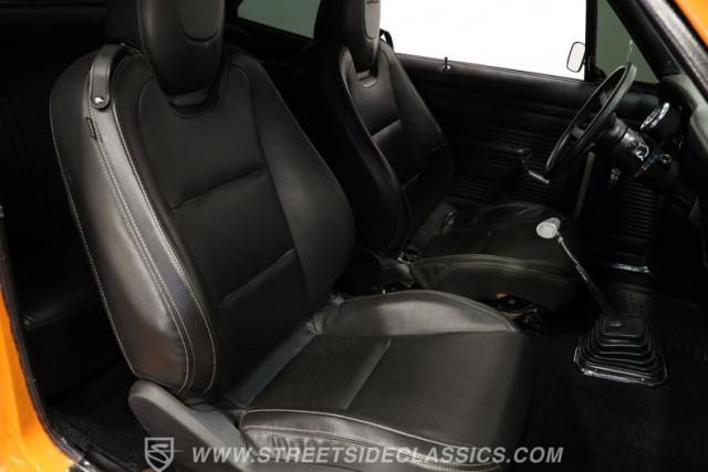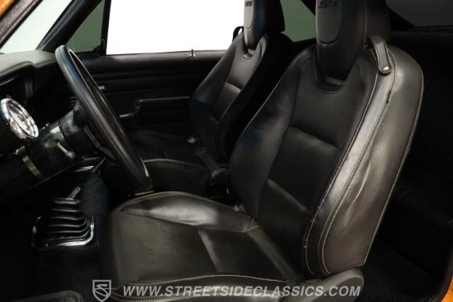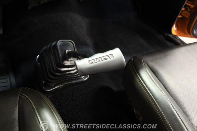 A really sharp interior awaits beyond those doors, at the center of which is a pair of leather-clad power bucket seats that began life in a late model Camaro. Featuring high backs and pronounced bolsters, the upgraded seats provide plenty of support for spirited driving, and proper attention to detail during their installation ensures that their power adjustability remains intact. In back, the bench seat appears nearly new, blending with the buckets nicely. As you climb inside and take hold of the aftermarket steering wheel, you\'ll notice the driver-centric components that have been added, including a trio of gauges that have been added to better monitor motoring functions, and a Hurst shifter that sits within easy reach on the transmission tunnel. A Sony AM/FM/CD stereo takes the place of the original radio for an upgraded audio experience.