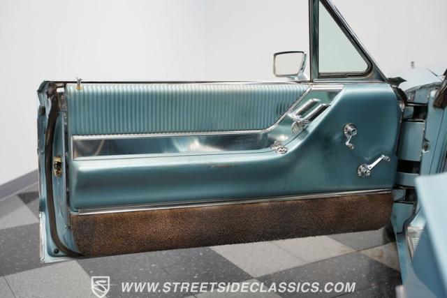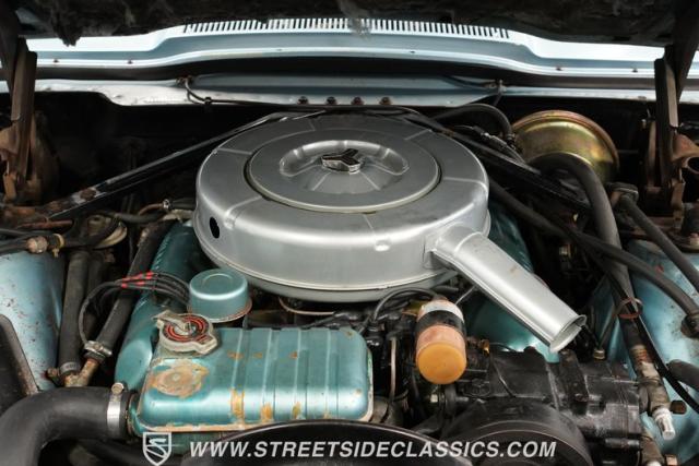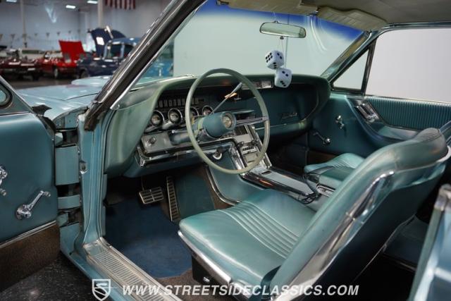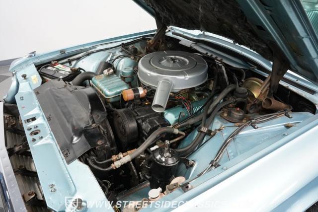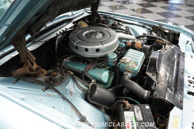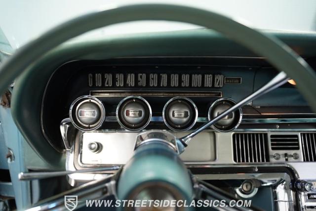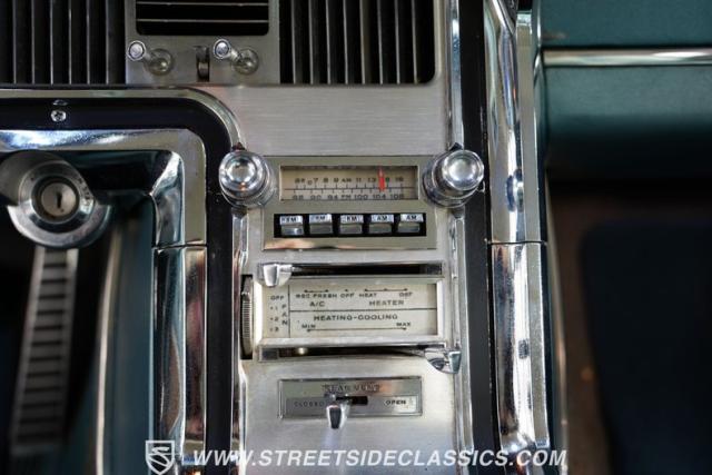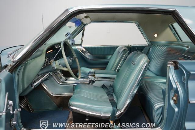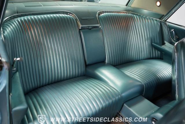 The Light Blue vinyl cockpit feels straight out of Mission Control, where every gauge and switch was positioned to give pilots - sorry, drivers - complete command of their vessel. The power bucket seats and sweeping console mirror the layout of a spacecraft, while the push-button AM/FM radio and climate controls could pass for launch sequence initiators. The full-length center console arcs through the cabin like a rocket\'s fuselage, dividing pilot and co-pilot in mid-century luxury.