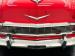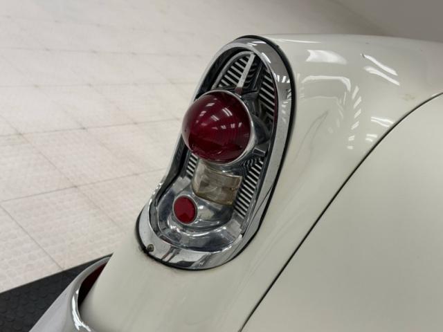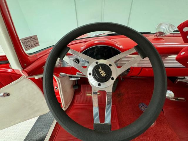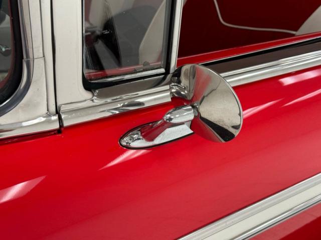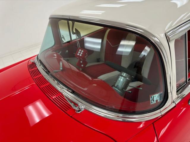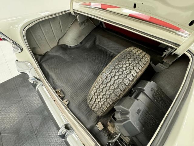 Matador Red and India Ivory make pops like a peppermint candy on this sweet ride, bright, striking and quintessentially 1950\'s. The side trim includes a hockey stick that turns to a point, encapsulating a spear of ivory that broadens into the rear quarter, over the trunk, and coating the roof, finally dripping down the pillars. The big chrome bumper and bold grille are straight and mirror-like, as is the V-crest and jet inspired hood ornament. There\'s lots of polished trim around the windows, all looking nice, and elaborate tail light treatments that are basically works of art mounted to the tail of the car. 45 series tires wrap around Boyd Coddington alloy wheels measuring 17-inch in the front and 18-inch in the back and fit the car wonderfully, adding a slightly modern dimension to the classic lines. Panel gaps, metalwork and paint are in great shape. Imperfections noted included checking in the ivory paint, some bubbling and other blemishes in the red, low on the body.