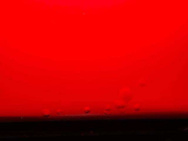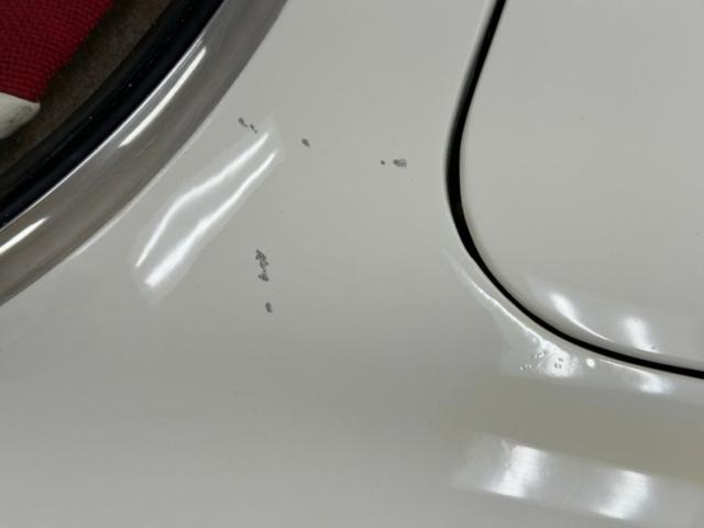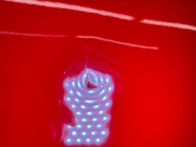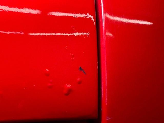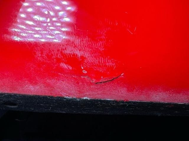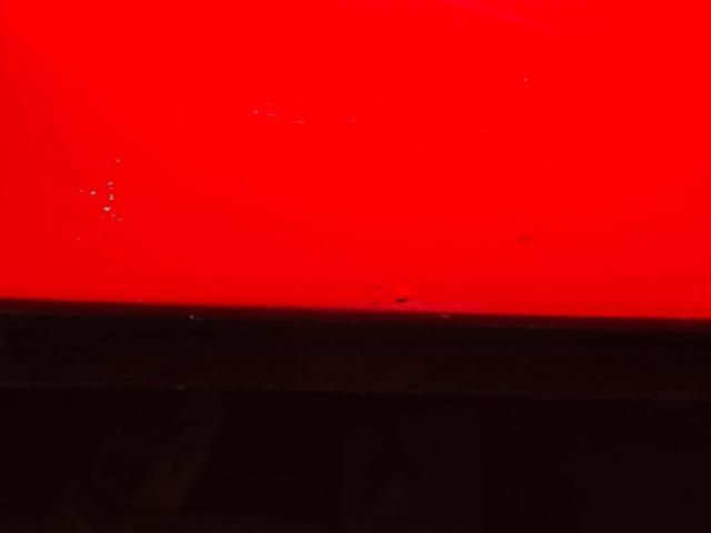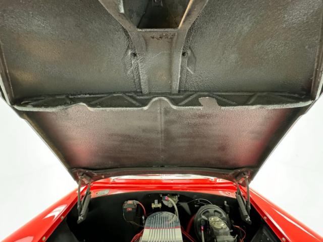 The red and white goodness continues on the inside where V-patterned stitched red panels meet flat white panels on the door cards, showing some bumpy edges but otherwise clean and intact. The V is recounted with white piping on red cloth inserts with white vinyl frames on the front bucket seats. It\'s not easy to keep white perfect and the driver\'s seat shows some compression and slight discoloration. In back, the color pattern is mirrored on the bench where the contrasting red and white pattern flows onto the package shelf, a nice little attention to detail. The polished APC steering wheelsits on a tilt column which leads to a digital instrumentation embedded in the fan shaped dash. A grooved metal trim piece spans the middle of the dash over the red painted lower and it all wraps around, taking the windshield with it with fantastic, curved glass. A Lokar skull shifter knob tops the shaft which is floor mounted and surrounded by red loop carpet in good and slightly soiled condition. Up top, the white headliner is in fine condition.