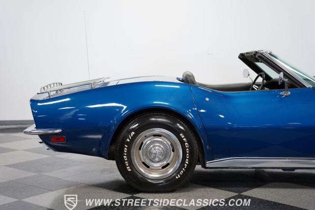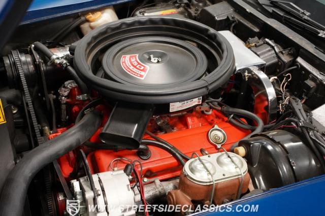 Finished handsomely in Dark Blue Metallic, this Stingray convertible features a factory luggage rack, a white folding convertible top, and an optional factory removable hardtop painted the same as the body. The classic Corvette look is completed with a set of factory 15x8 rally wheels wrapped with BF Goodrich Radial T/A raised white-lettered tires.
