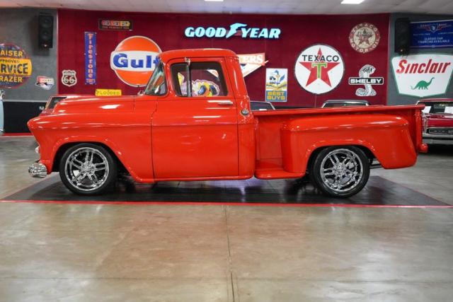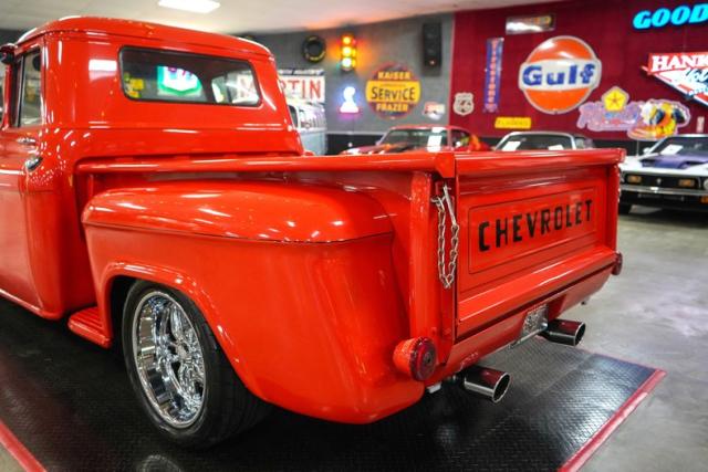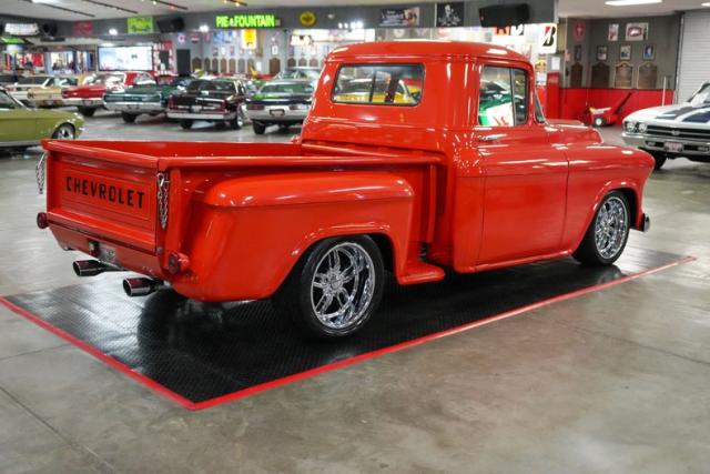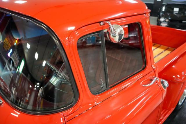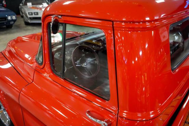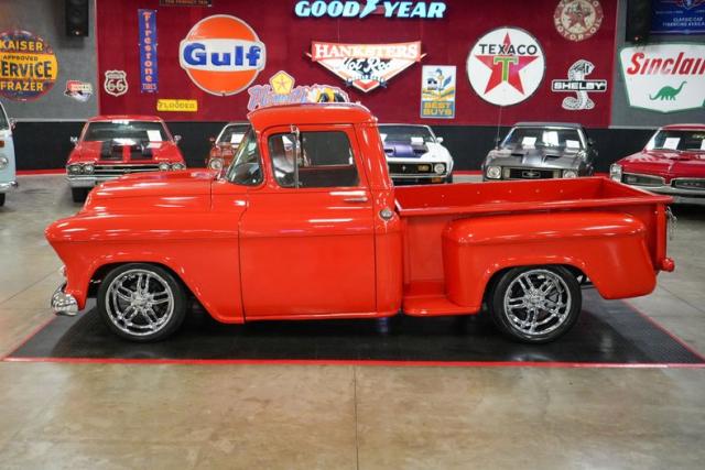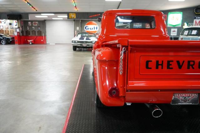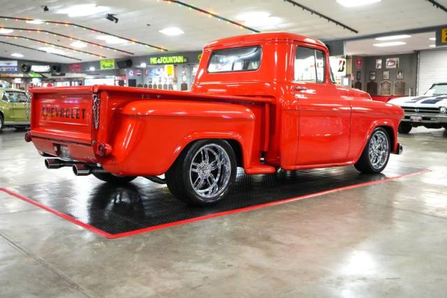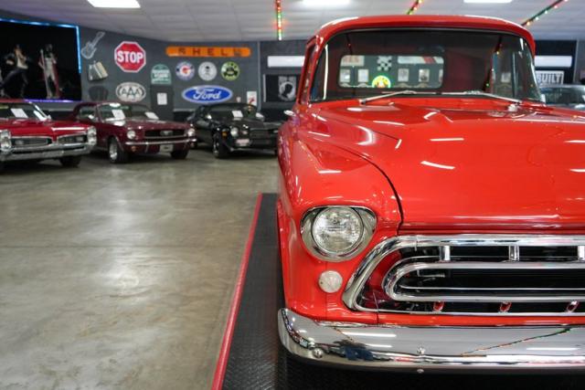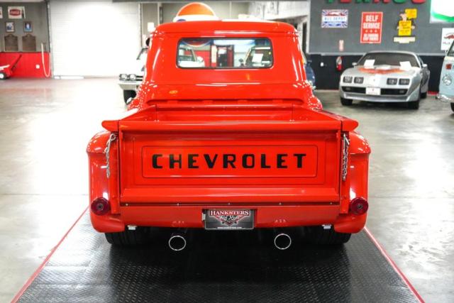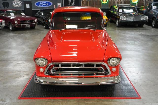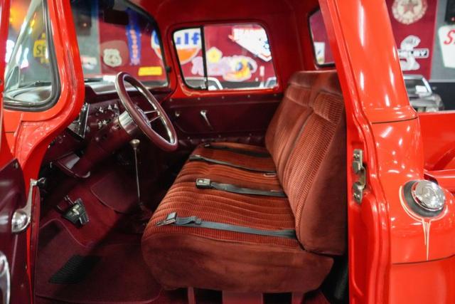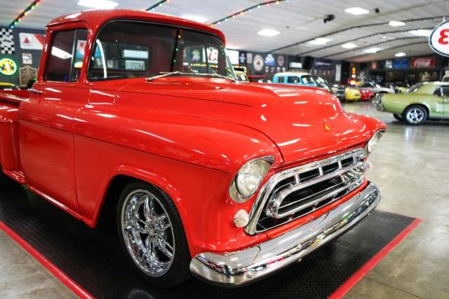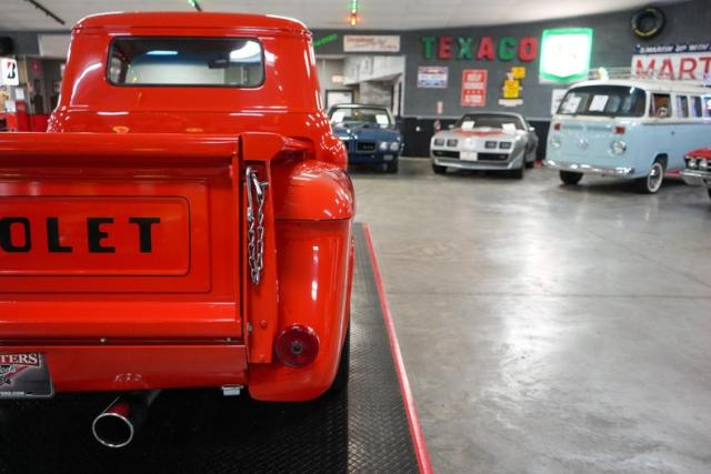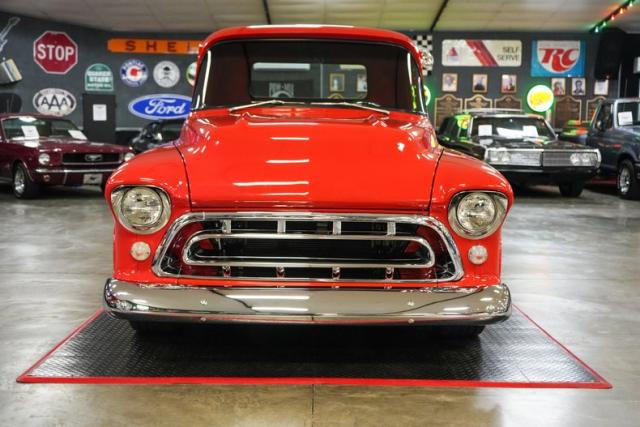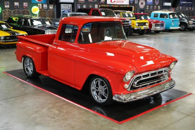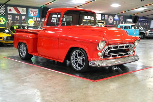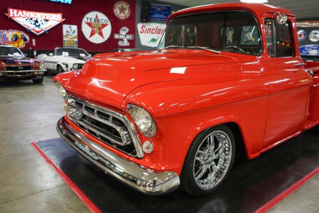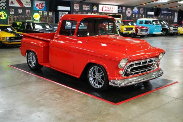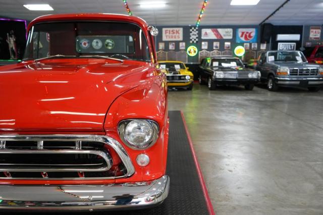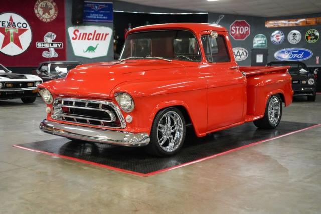 This 1957 Chevrolet 3100 Stepside Pickup is a classic truck with modern performance upgrades. Powered by a 350 Small Block Chevy V8 paired with a TH350 automatic transmission and a 10-bolt rear end with 2.73 gears, it delivers smooth cruising power. Equipped with power steering, power brakes, and front disc brakes, it offers improved drivability. The red cloth interior adds a vibrant contrast to the bold orange exterior. Performance upgrades include an Edelbrock intake and carburetor, Mallory ignition components, Hedman long tube headers, and a Be Cool aluminum radiator. Riding on 18\" US Mags wheels, this pickup blends vintage style with modern muscle. THIS VEHICLE QUALIFIES FOR FREE SHIPPING AND A WARRANTY!!