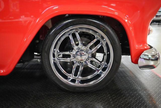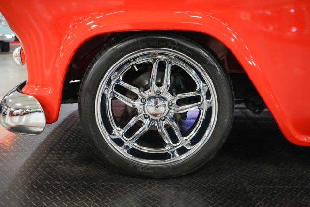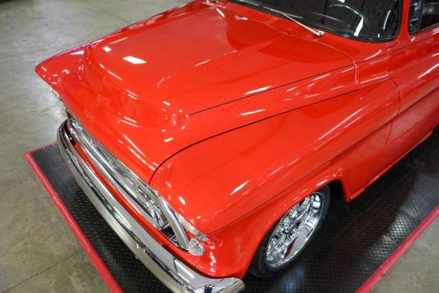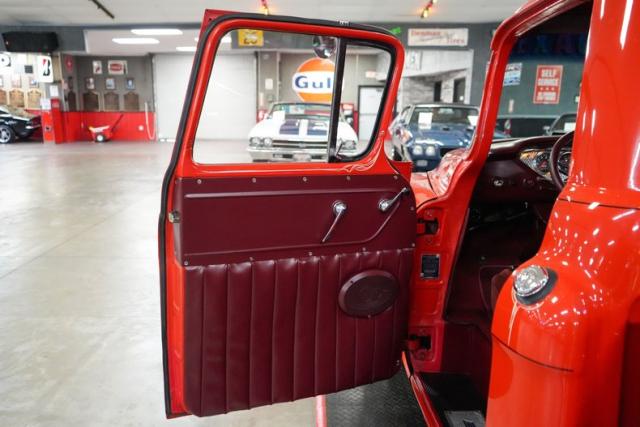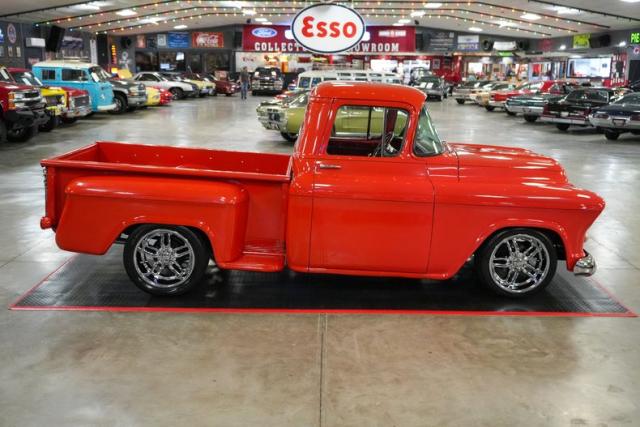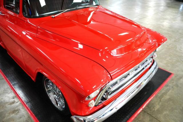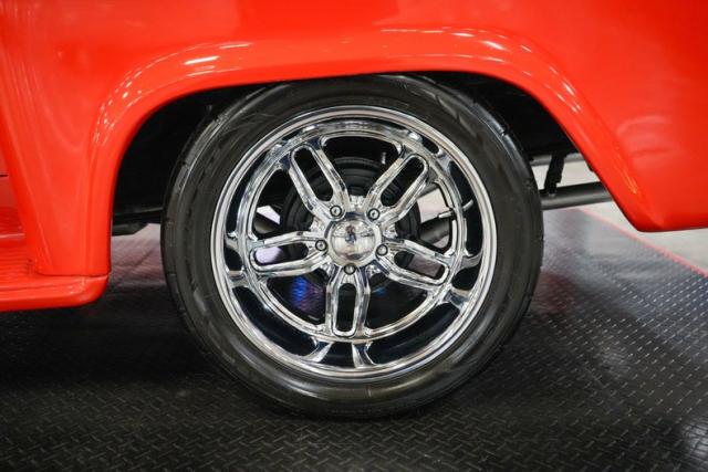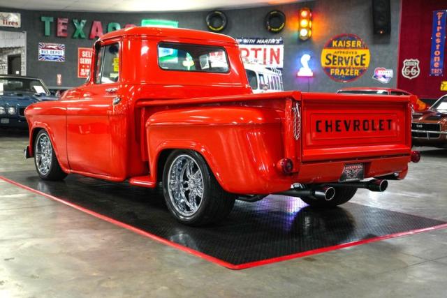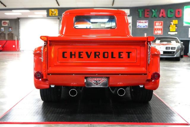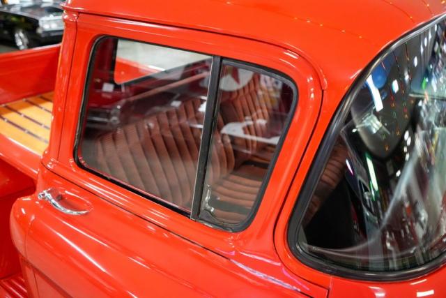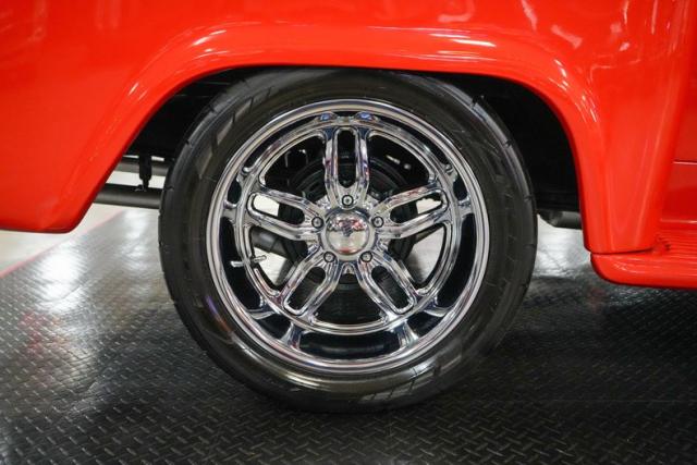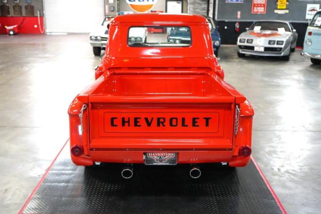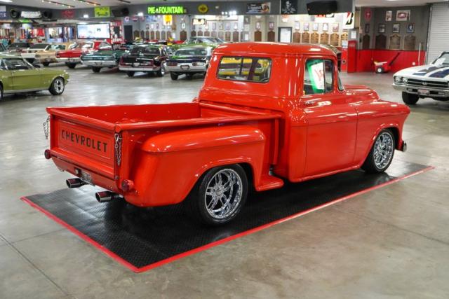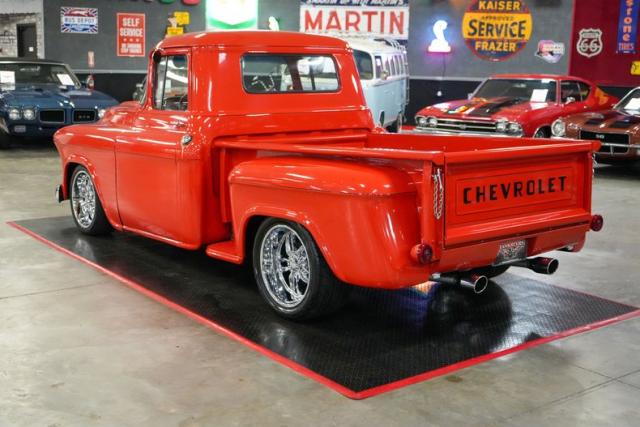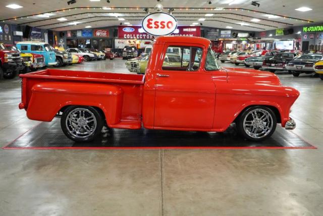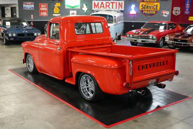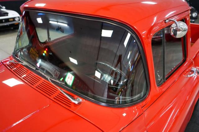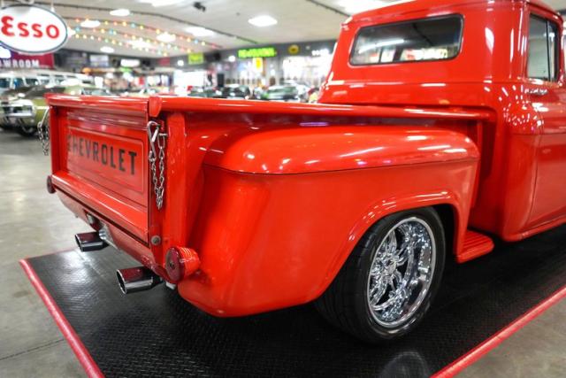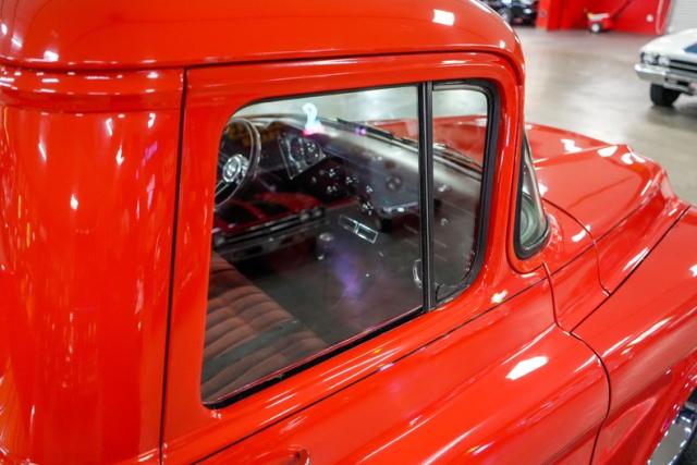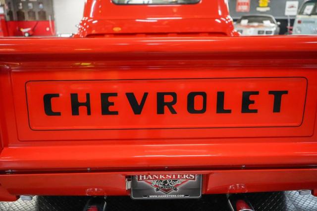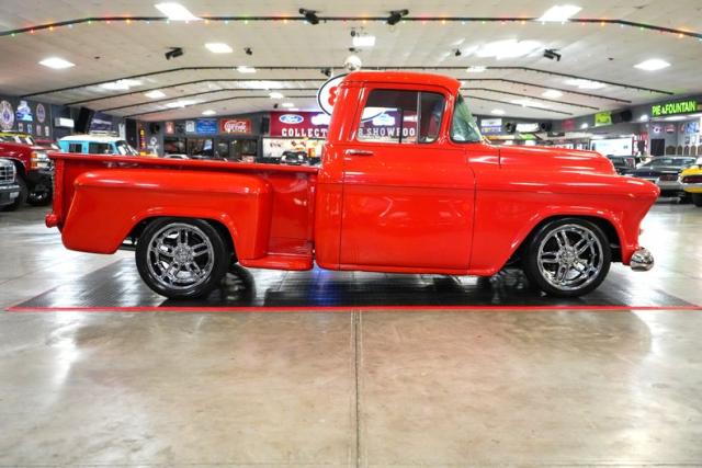 This 1957 Chevrolet 3100 Stepside Pickup is a classic truck with modern performance upgrades. Powered by a 350 Small Block Chevy V8 paired with a TH350 automatic transmission and a 10-bolt rear end with 2.73 gears, it delivers smooth cruising power. Equipped with power steering, power brakes, and front disc brakes, it offers improved drivability. The red cloth interior adds a vibrant contrast to the bold orange exterior. Performance upgrades include an Edelbrock intake and carburetor, Mallory ignition components, Hedman long tube headers, and a Be Cool aluminum radiator. Riding on 18\" US Mags wheels, this pickup blends vintage style with modern muscle. THIS VEHICLE QUALIFIES FOR FREE SHIPPING AND A WARRANTY!!