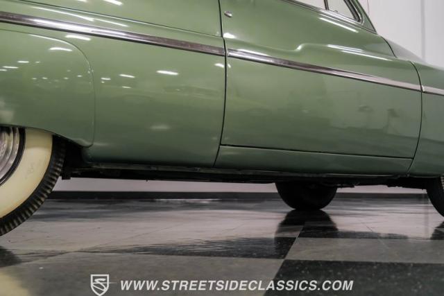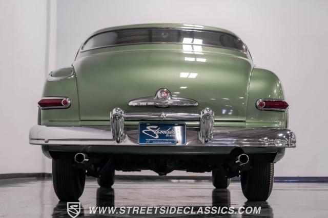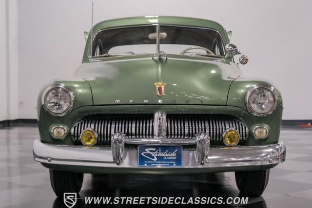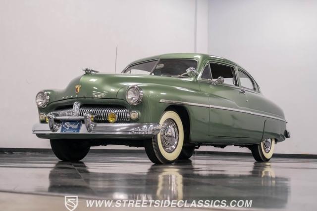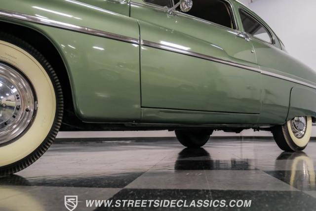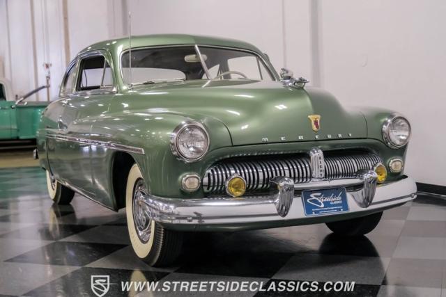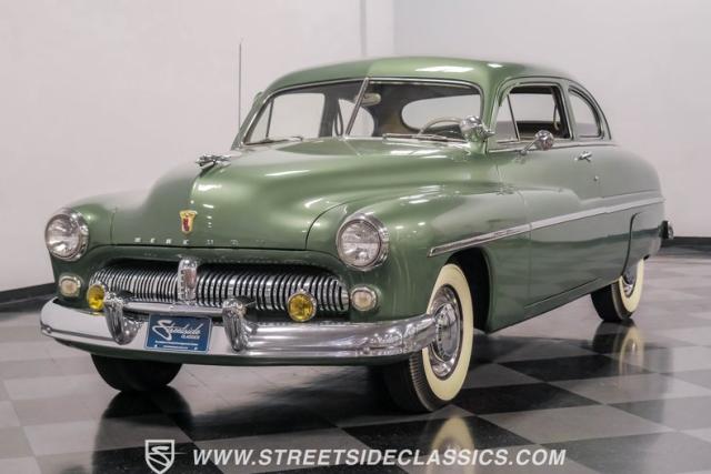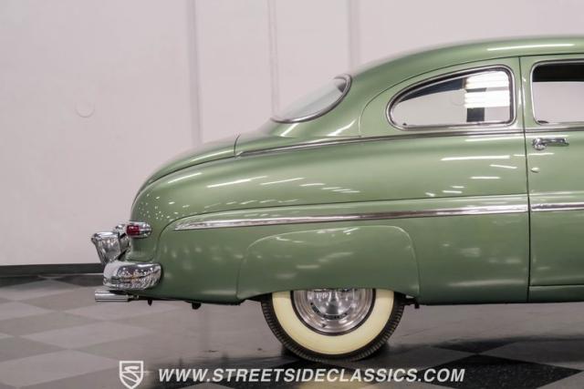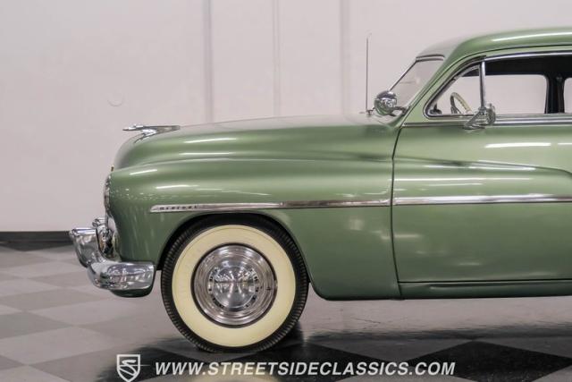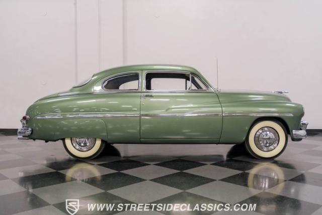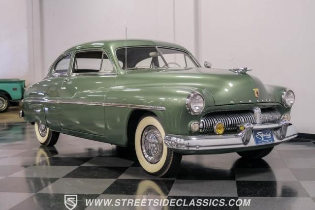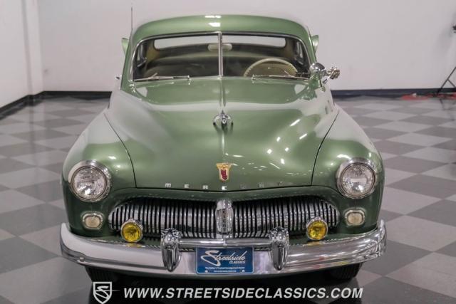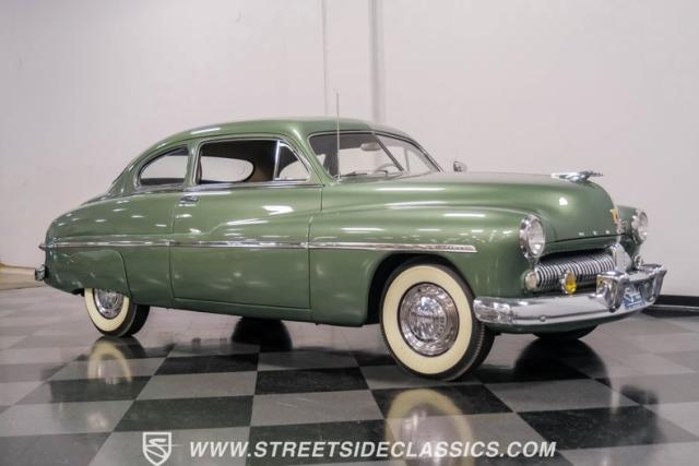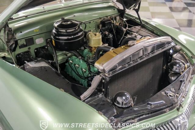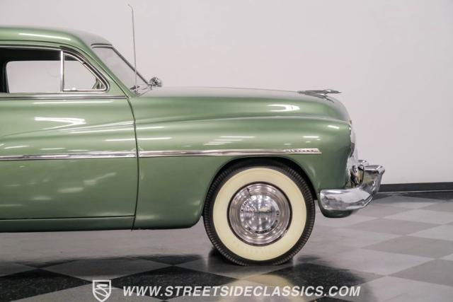 Somehow, this 1949 Mercury Eight has survived all these years without being converted into a custom lead sled - a rare feat for these iconic coupes! As a stock survivor with a repaint, the Berwick Green finish creates a bold presence, enhanced by loads of chrome including smaller pieces like the vent window air deflectors, gas door trim surround and front and rear bumper guards. Special touches include amber fog lights and a driver-side spotlight that are just 1940s cool and the body lines flow gracefully over factory fender skirts, while Firestone 7.10-15 wide whitewall tires wrap the 15-inch steel wheels for a classic stance.