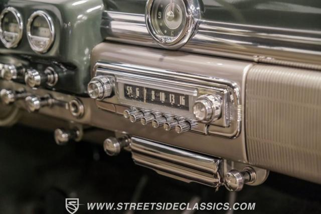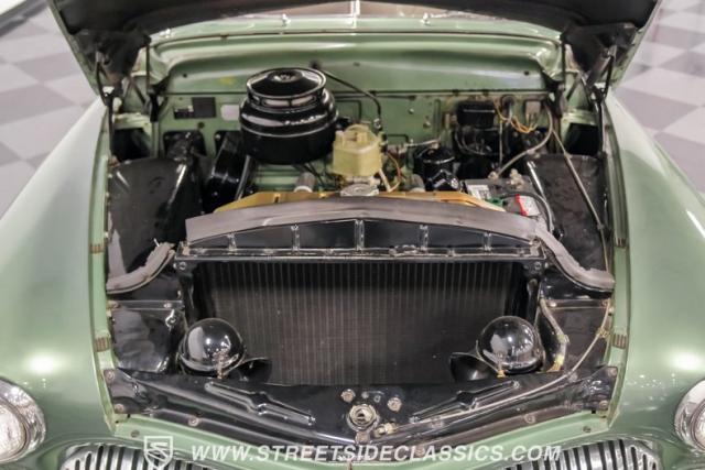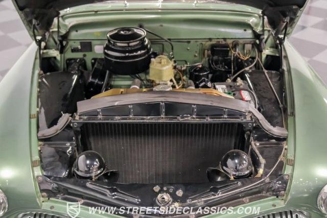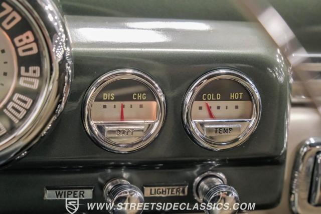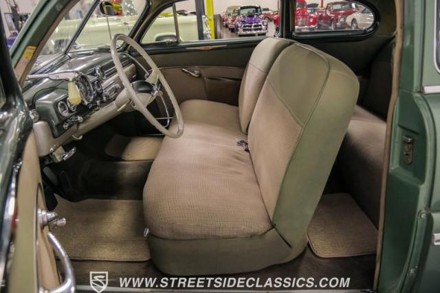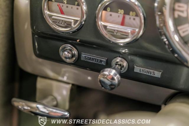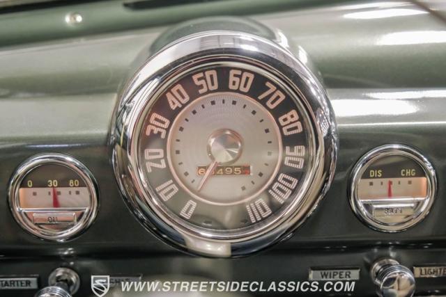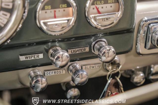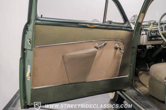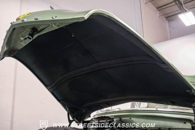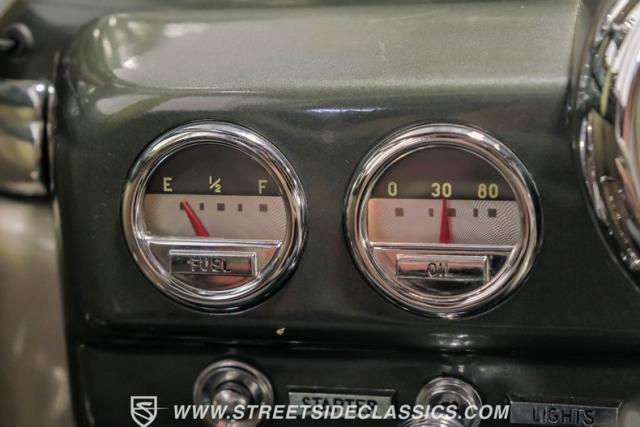 Inside, the green and tan interior maintains its vintage appeal with checkered broadcloth and vinyl bench seating. The stylized dashboard houses the original instrumentation panel and controls, including the factory column shifter. A split bench seat provides comfort for long drives, while green carpeting adds a cohesive look throughout. The trunk offers ample storage space with correct materials and finishes.