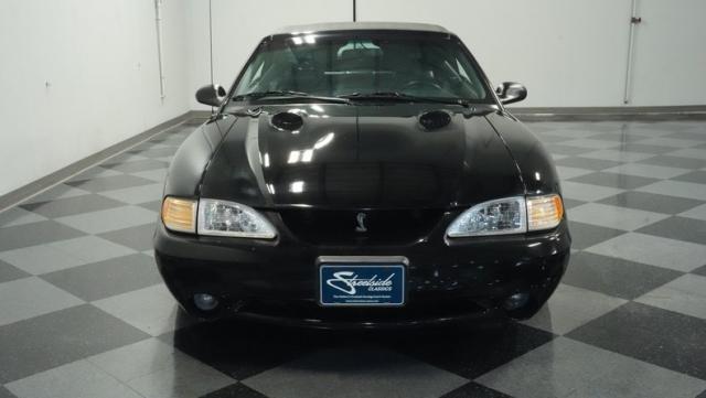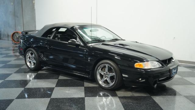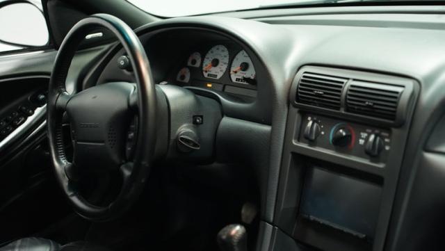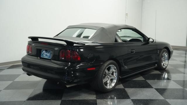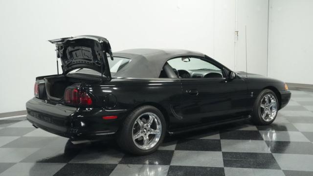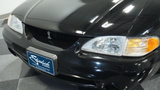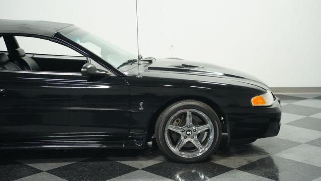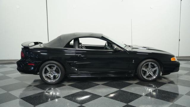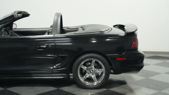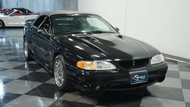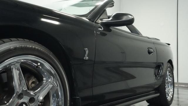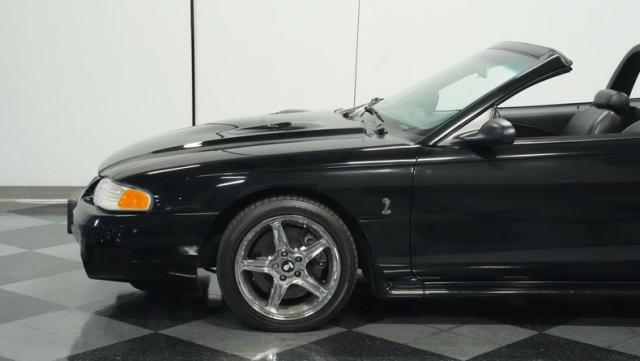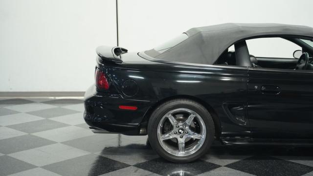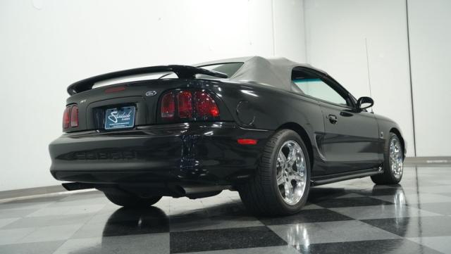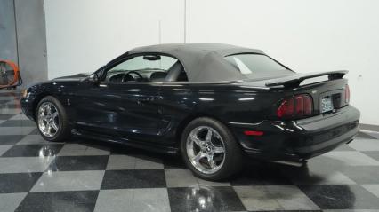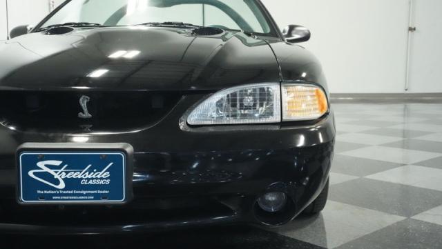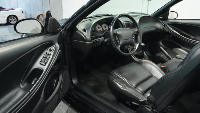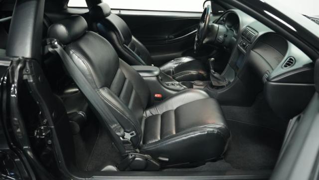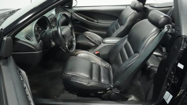 This 1998 Ford Mustang Cobra SVT Convertible, number 2707 of 3480 produced, showcases Ford\'s performance prowess in a sleek, open-top package. The exterior flaunts a deep black finish that accentuates every muscular curve and aggressive line of this limited-production pony car. Its athletic stance is amplified by 17-inch wheels, which are wrapped in meaty 255/40ZR17 front and 315/35ZR17 rear tires. The black canvas convertible top, featuring a glass rear window, adds versatility to this high-performance machine. A subtle yet functional addition is the roll bar, enhancing both safety and structural rigidity for top-down driving.