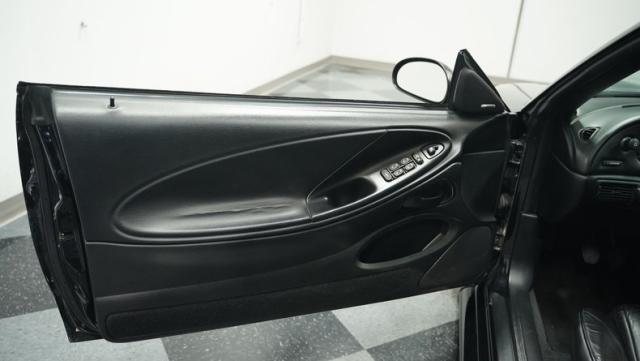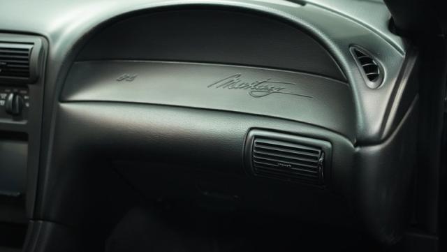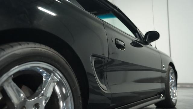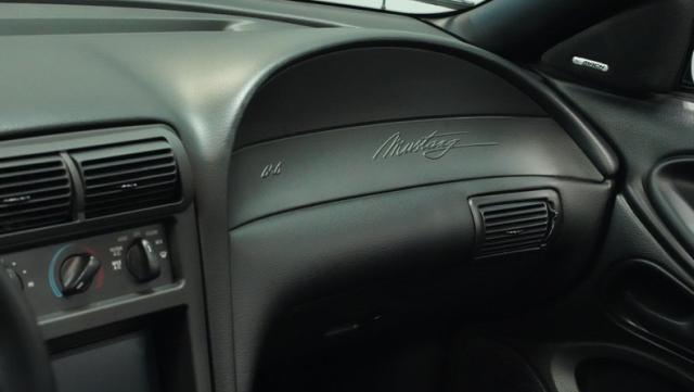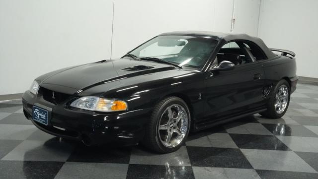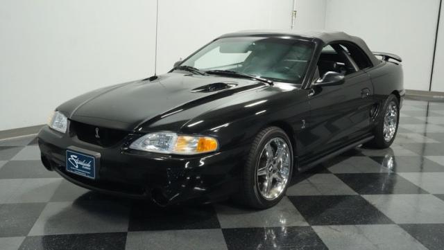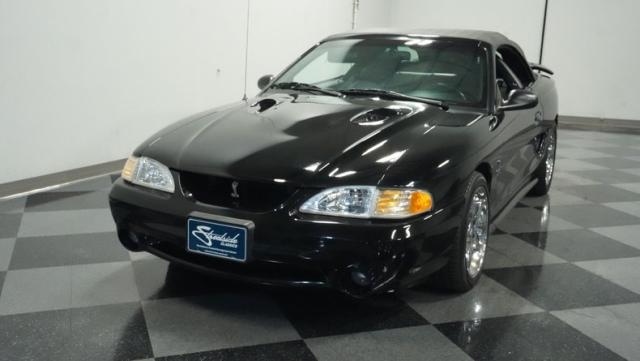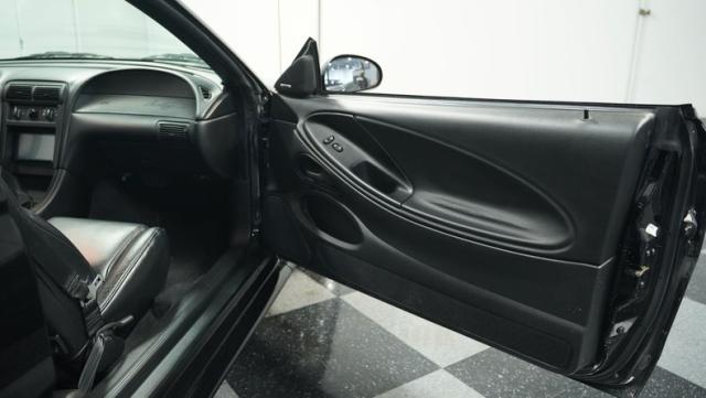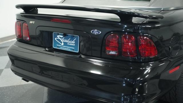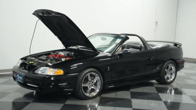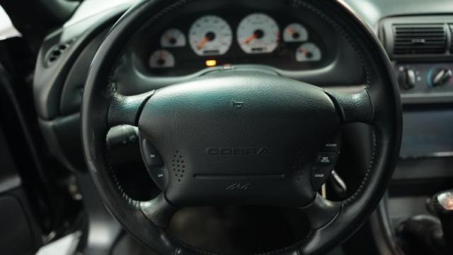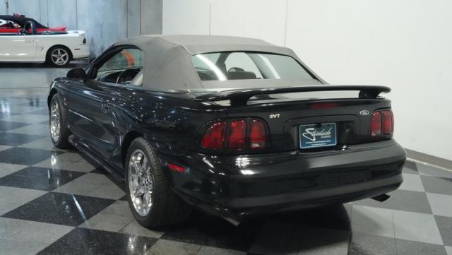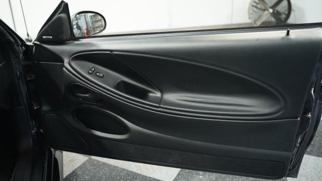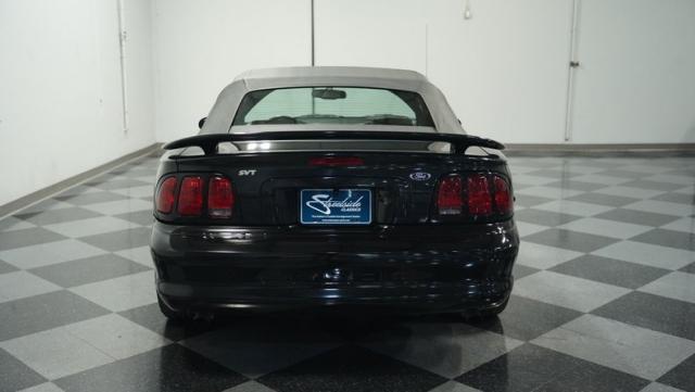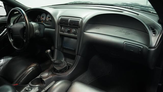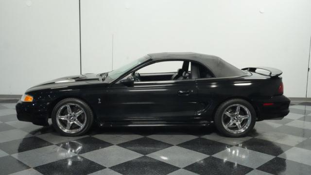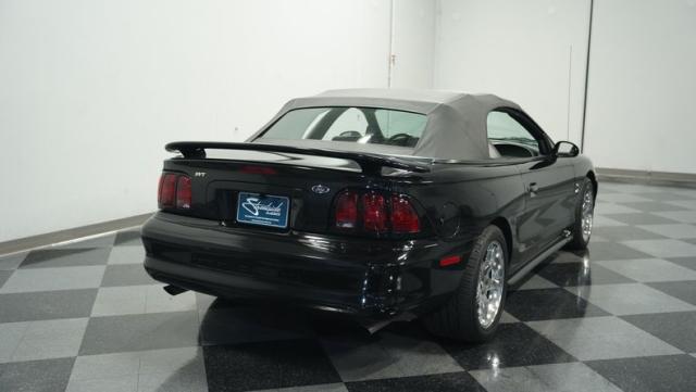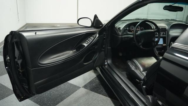 This 1998 Ford Mustang Cobra SVT Convertible, number 2707 of 3480 produced, showcases Ford\'s performance prowess in a sleek, open-top package. The exterior flaunts a deep black finish that accentuates every muscular curve and aggressive line of this limited-production pony car. Its athletic stance is amplified by 17-inch wheels, which are wrapped in meaty 255/40ZR17 front and 315/35ZR17 rear tires. The black canvas convertible top, featuring a glass rear window, adds versatility to this high-performance machine. A subtle yet functional addition is the roll bar, enhancing both safety and structural rigidity for top-down driving.