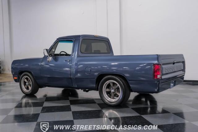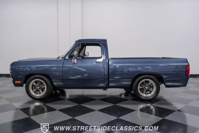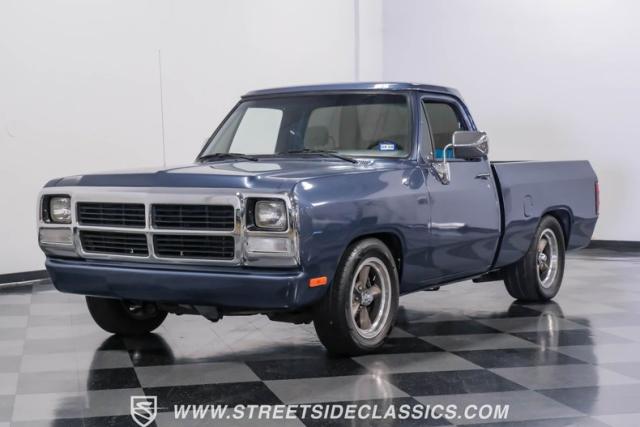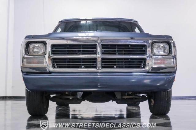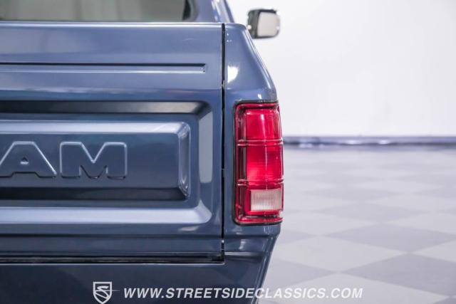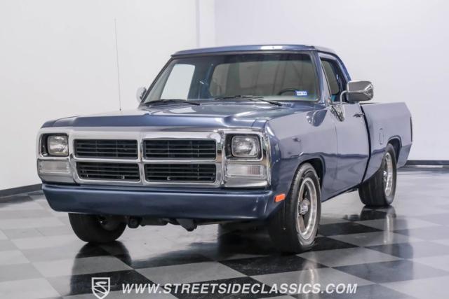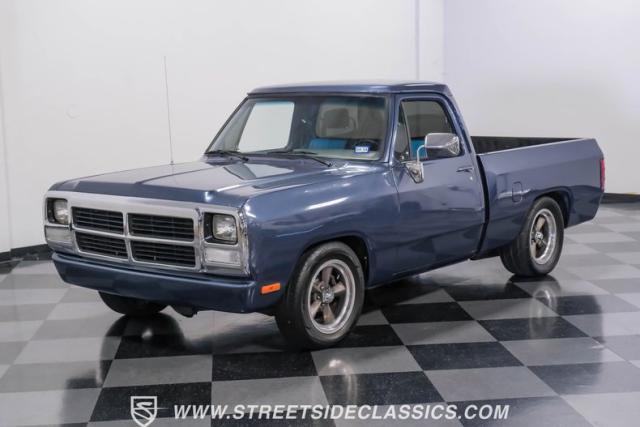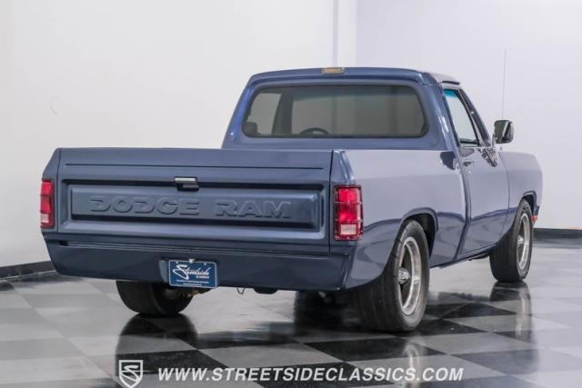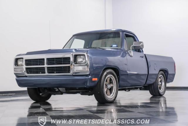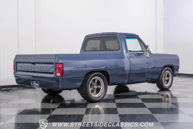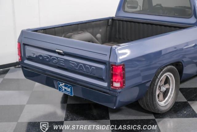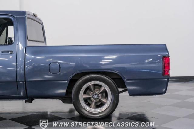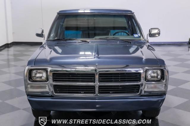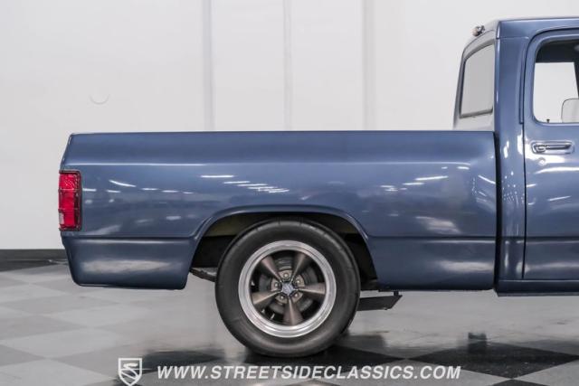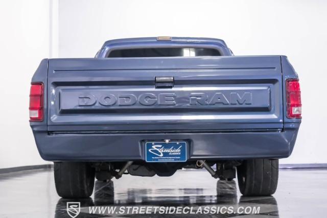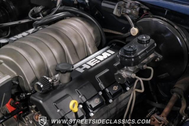 This 1989 Dodge D150 Hemi Restomod has undergone a thorough performance transformation. The striking blue exterior radiates against custom-designed smooth front and rear panels that replace traditional bumpers. A late-model chrome D-Series grille leads the way, while the aggressive stance comes from a precision-engineered lowering kit. The pickup's muscular profile rolls on 17-inch U.S. Mags wrapped in 235/60R17 front and massive 305/45R17 rear tires that give this truck serious street presence. A professional spray-in bedliner protects the cargo area.