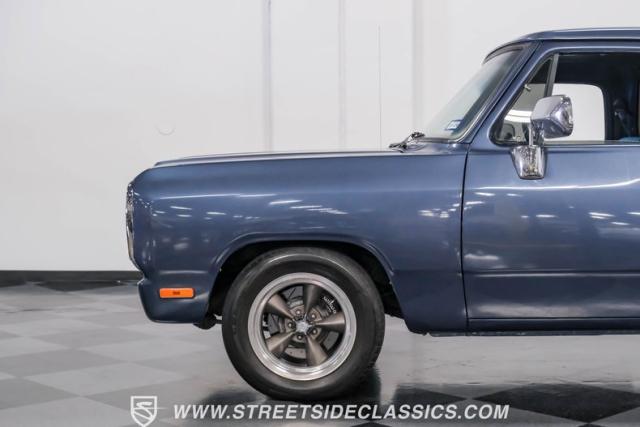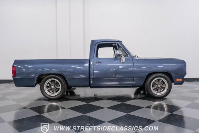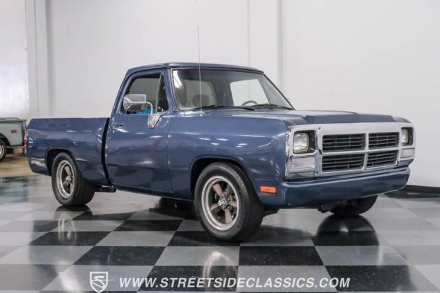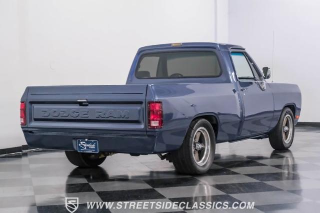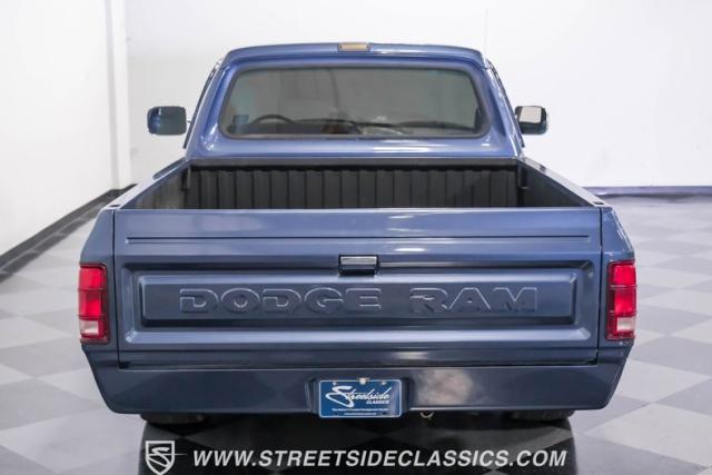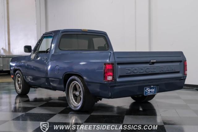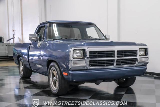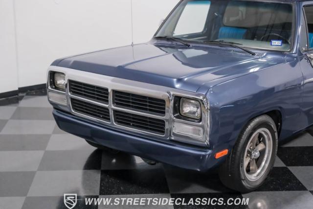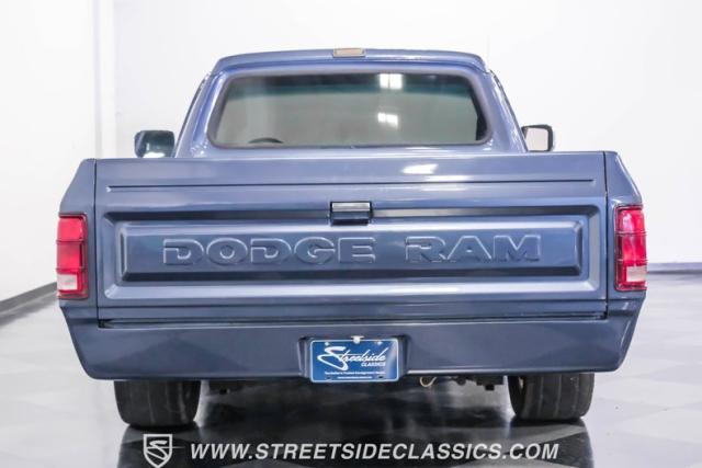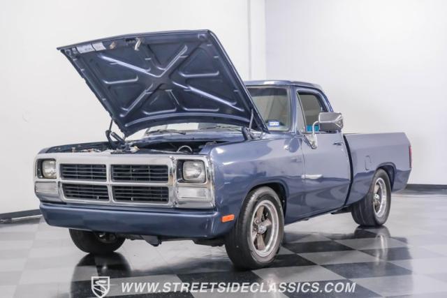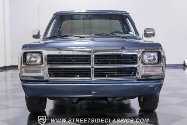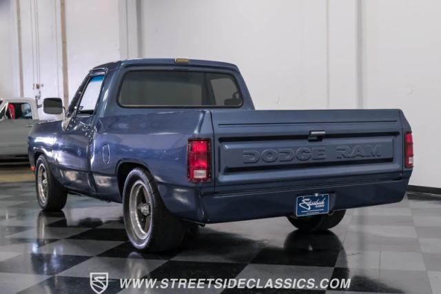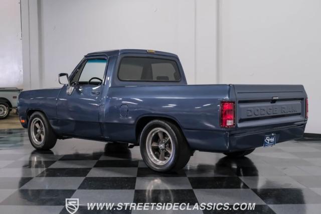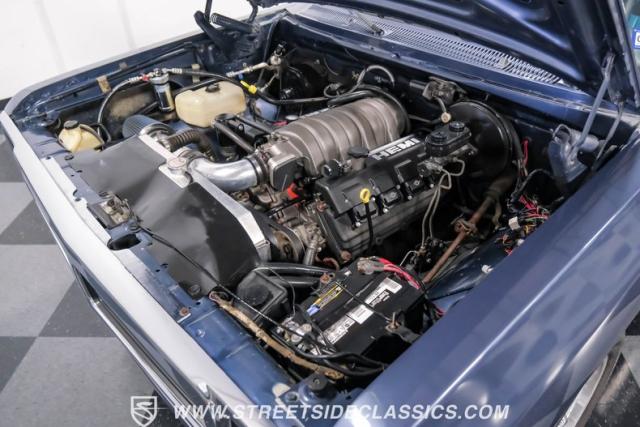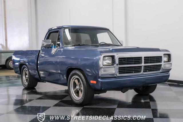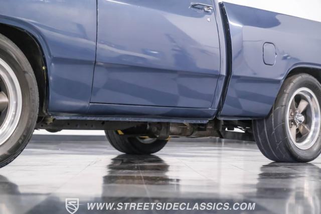 This 1989 Dodge D150 Hemi Restomod has undergone a thorough performance transformation. The striking blue exterior radiates against custom-designed smooth front and rear panels that replace traditional bumpers. A late-model chrome D-Series grille leads the way, while the aggressive stance comes from a precision-engineered lowering kit. The pickup's muscular profile rolls on 17-inch U.S. Mags wrapped in 235/60R17 front and massive 305/45R17 rear tires that give this truck serious street presence. A professional spray-in bedliner protects the cargo area.