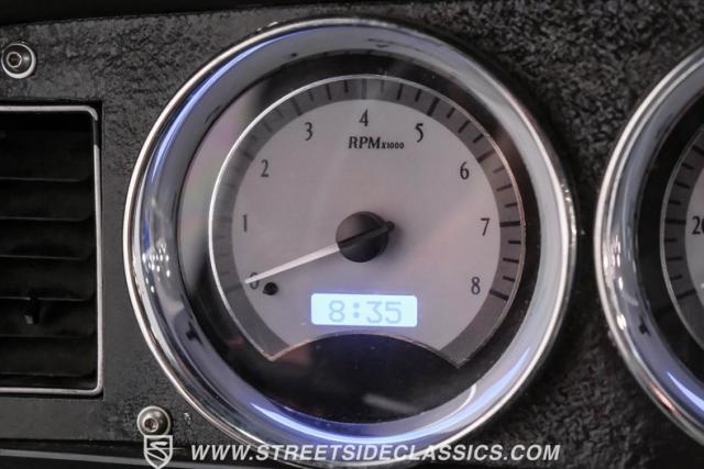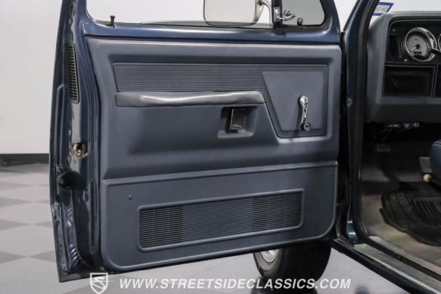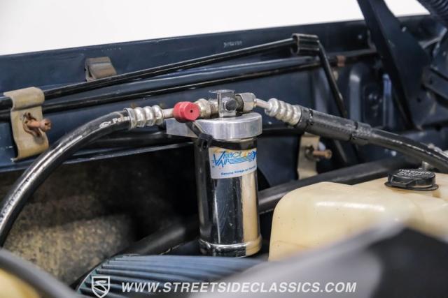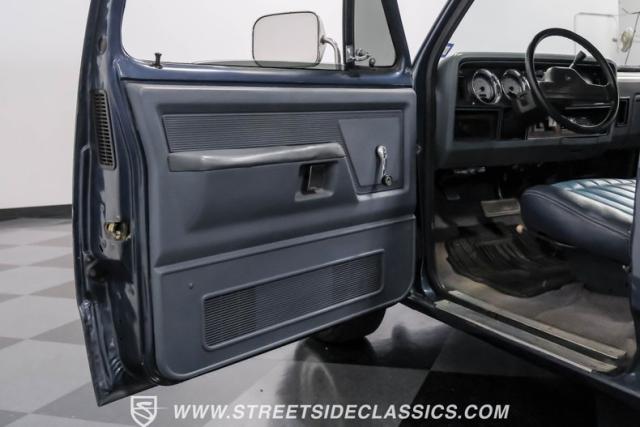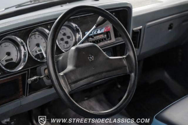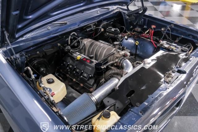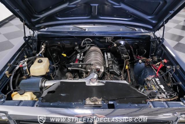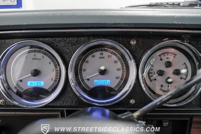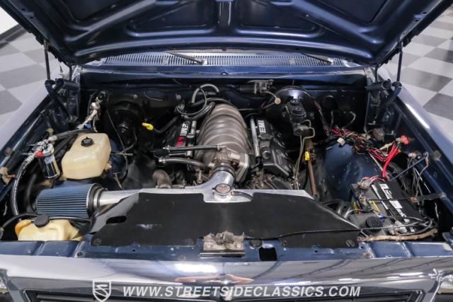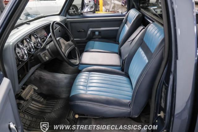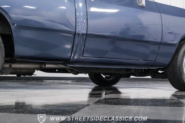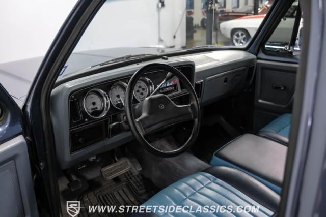 The custom two-tone blue interior features low-back bucket seats with a folding center armrest that fit the truck\'s performance attitude. White Dakota Digital gauges provide crystal-clear readouts while a Pioneer AM/FM/CD/Bluetooth stereo supplies the entertainment. The sound-deadened interior includes padded door panels matching the upholstery theme. Air conditioning keeps the cabin comfortable while power steering makes maneuvering effortless.