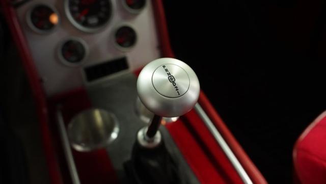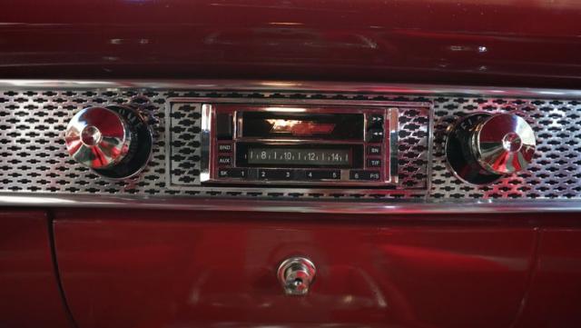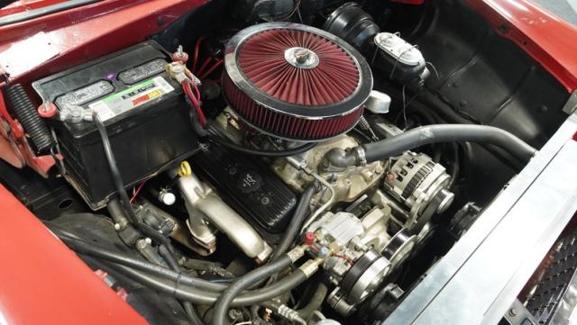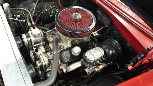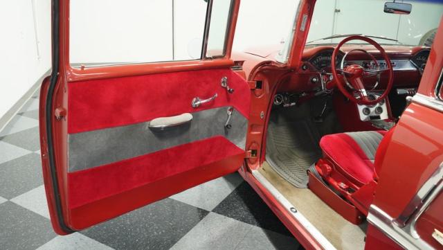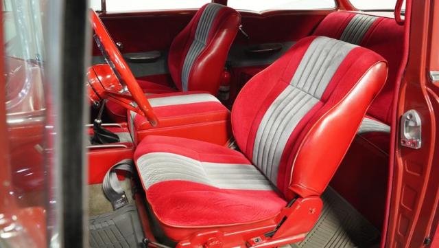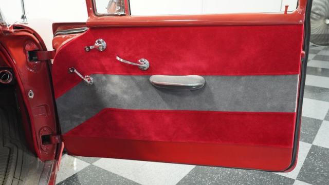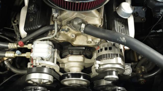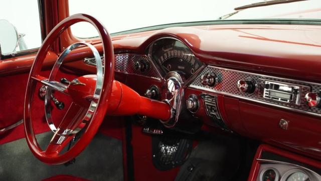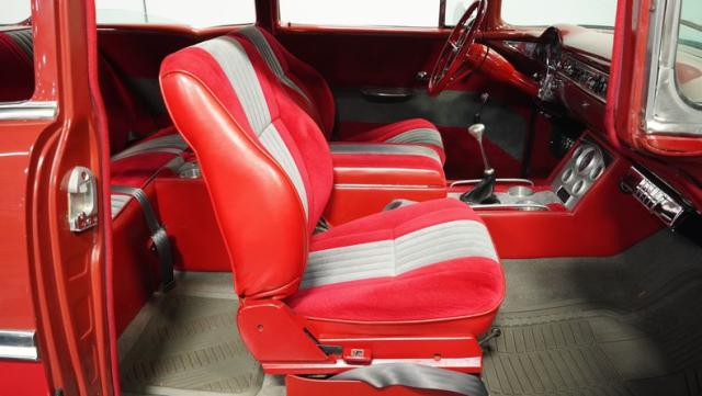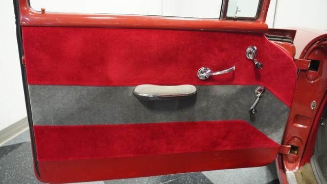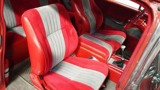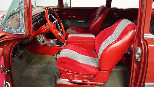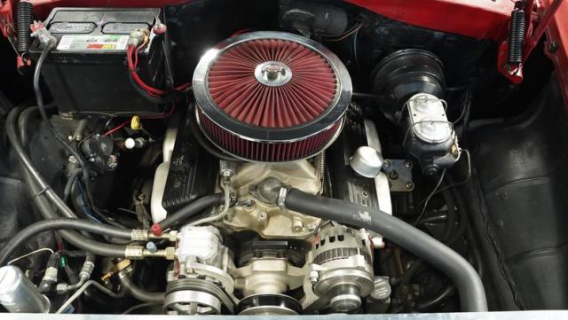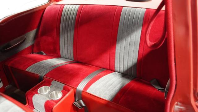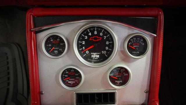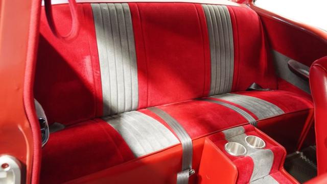 Finished attractively in Red, this classic rolls on a set of Chevy rally wheels that are extra wide in the rear and wrapped with tires staggered 215/70R15 in the front and 235/70R15 rear for just the right stance. The custom interior is trimmed in red and gray cloth with comfortable bucket seats divided by a custom full-length console with floor shifter, cup holders and storage compartment that sweeps up to meet the dash. This forward section of the console houses an air vent and a set of bow-tie logo Autometer gauges that include oil pressure, water and transmission temperature, volt meter and tachometer. A modern air conditioning system keeps the cabin cool and front and rear seat belts keep its occupants safe.