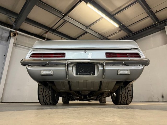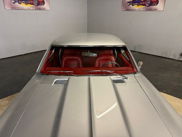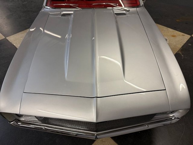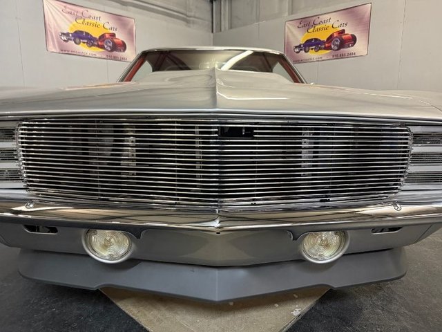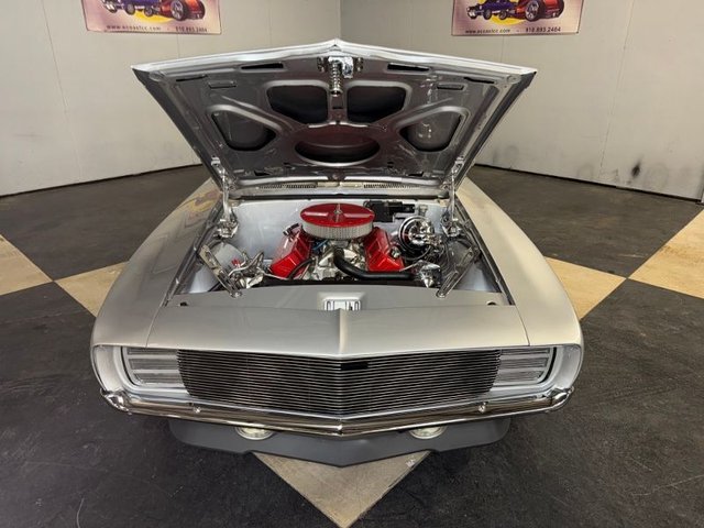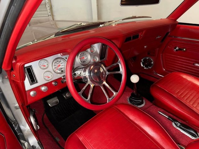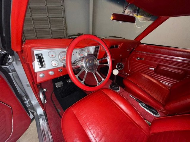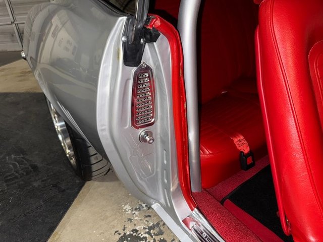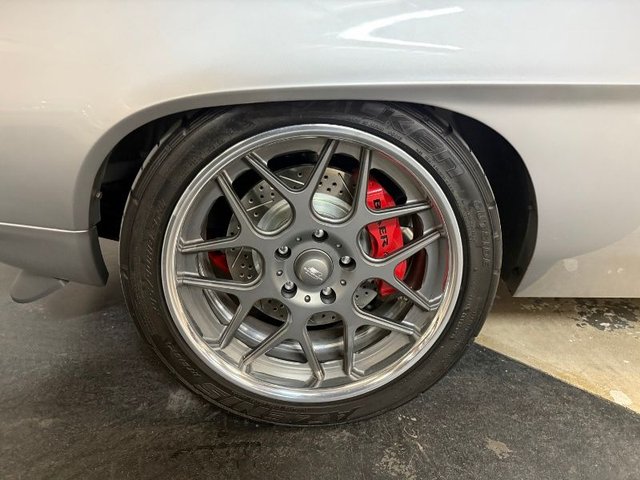 Complete Rotisserie build. Painted Viper silver this car is slick and straight with dark gray Hockey stripes, new door handles, front and rear bumpers are new. Custom grill, hideaway headlights electric, new side marker lights, new tail lights and headlights, new back up lights, front and rear spoilers. All glass is tinted and new. New felt and rubber, windshield, rear polished moldings. The drip rail moldings, door locks, drivers’ side outside mirror Chevy logo all new. The wiper arms are polished and blades by Detroit and new. Billet Specialties wheels are gunmetal with polished lips, Falken Azenis tires; 245/40R18 18x7 in front and 295/40R18 18x12 in rear. Big Baer 4-wheel Power Disc brakes drilled and slotted rotors red calipers, 4-link rear suspension with coilovers, UMI Tubular red arms with coilovers, Big sway bar 12-bolt rear end with Jeg’s aluminum in center cover 3.73 Posi traction. Dual exhaust. Underside looks like the top side. Good looking car that is ready to go and show!