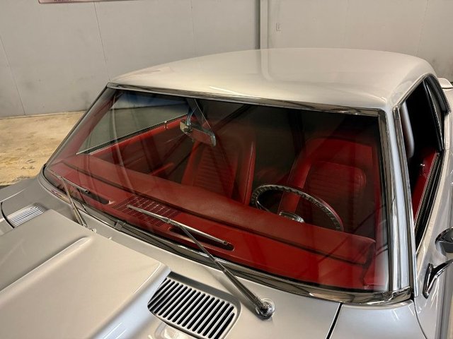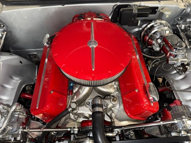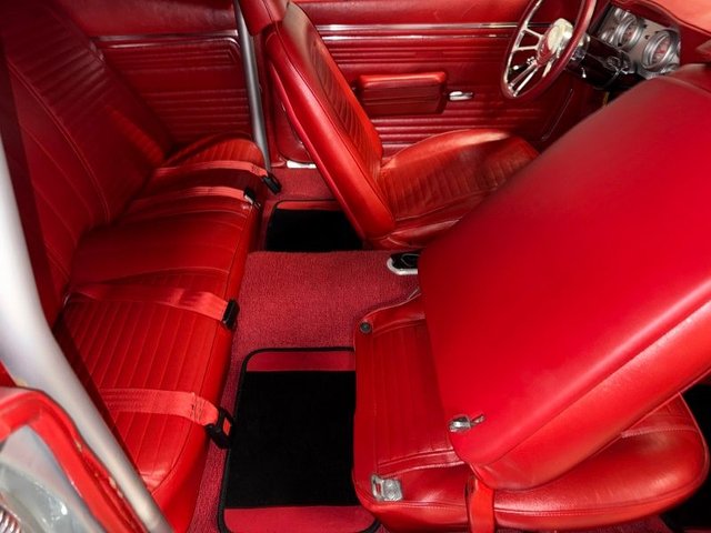 Interior is Lipstick Red new and padded, dash face painted red, new Covan dash cluster silver with Autometer gauges with silver face, Volts-fuel-MPH-RPM-water-oil. Sony AM/FM/XM Stereo with Xplod Speakers in kick panels and package tray. Billet custom knobs for wiper and headlights. Chrome tilt Ididit column with chrome tilt and turn signal knobs. Half wrapped red leather polished steering wheel. Red carpet, black and red carpeted floor mats in front and rear, door panels, arm rest and arm rest base, chrome door handles, window cranks, sill plates, package tray with Xplod speakers (2). Lokar emergency brake, red headliner, chrome rearview mirror, dome light, rear roll bar is silver. Rear red seatbelts, Hurst short shifter with white 6-speed ball. All new inside and gorgeous!