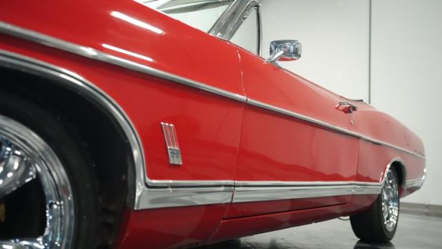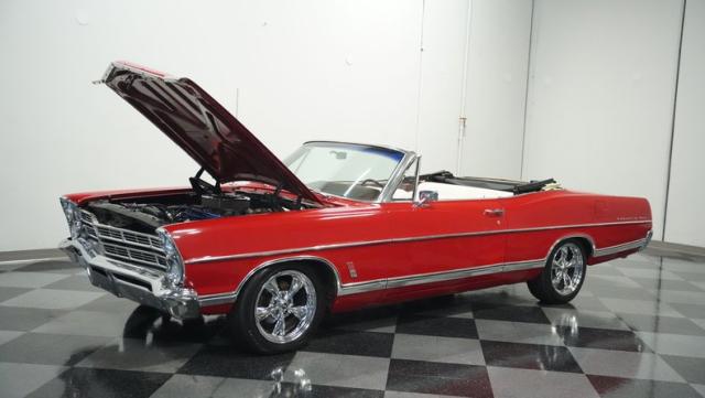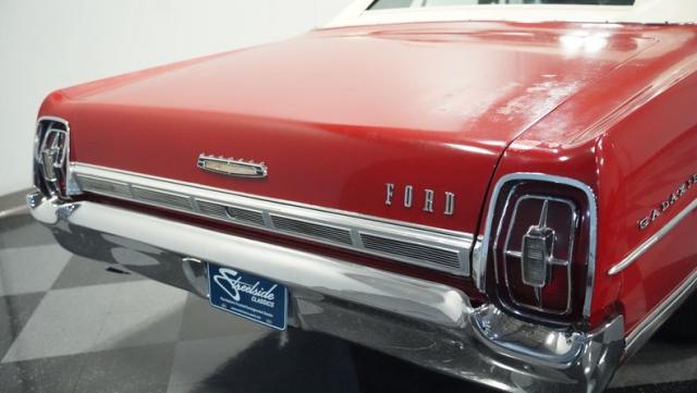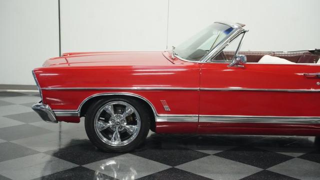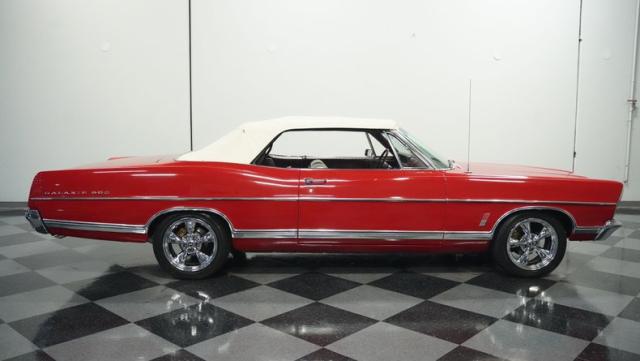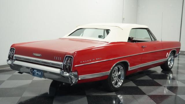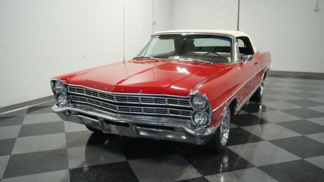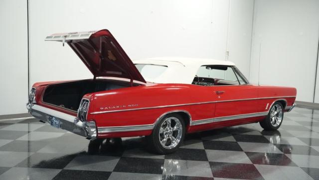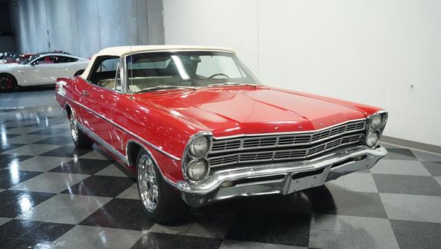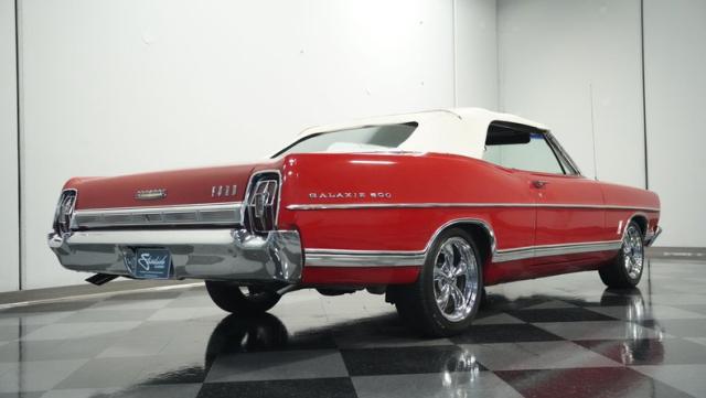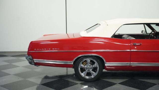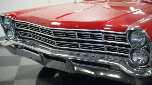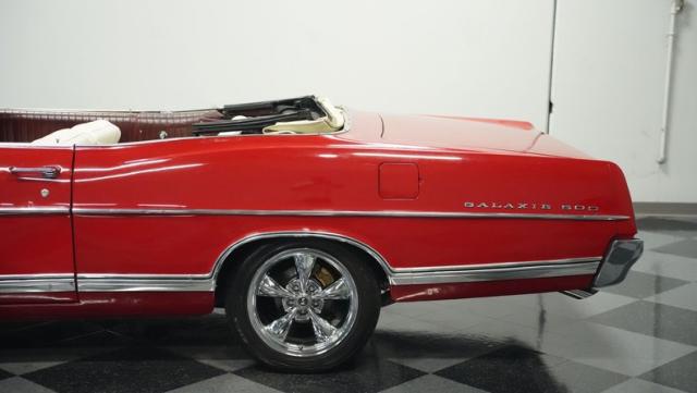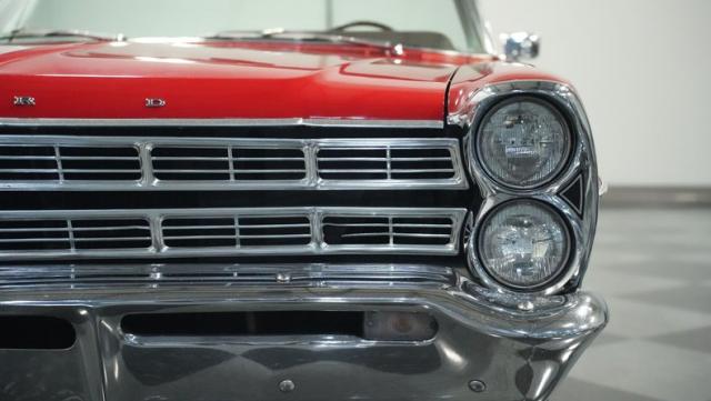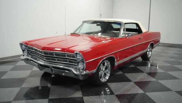 This 1967 Ford Galaxie 500 Convertible commands respect with its Candy Apple Red finish. The sleek body stretches 17 feet long, showcasing the era when American cars ruled the road. Chrome accents highlight the Galaxie\'s muscular lines, from the bold front grille to the sculpted rear panels. The white convertible top provides a sharp contrast, folding away to reveal the open sky. Rolling on 17\" wheels wrapped in beefy 225/55ZR17 tires, this Galaxie combines classic style with modern road grip. Dual exhaust tips peek out from the rear, hinting at the power of the 390 V8 engine.