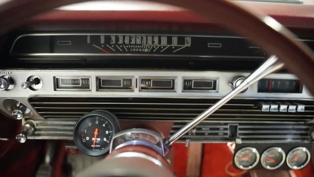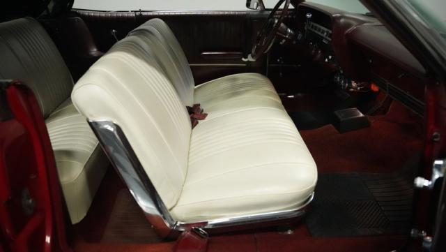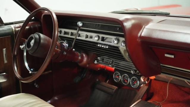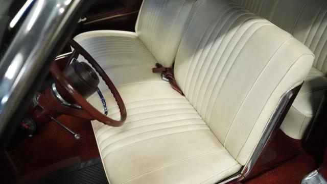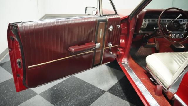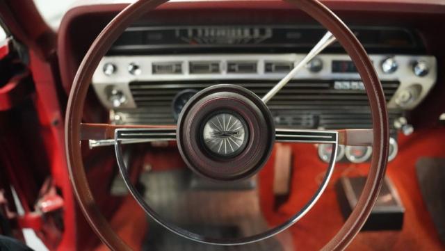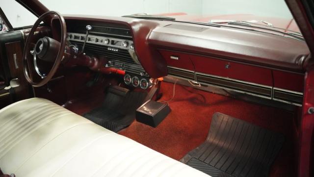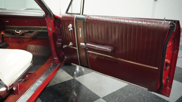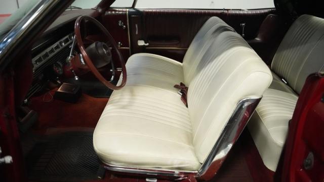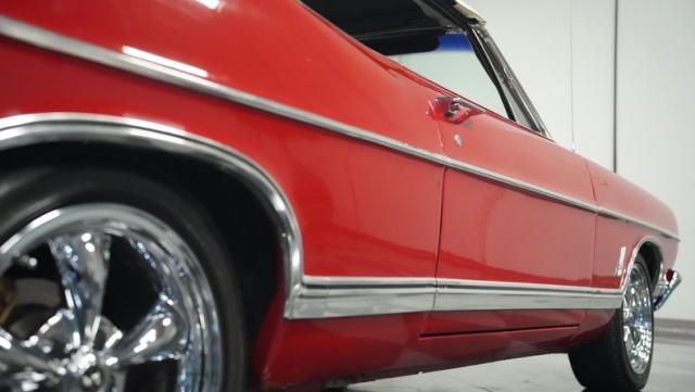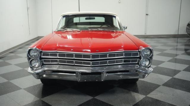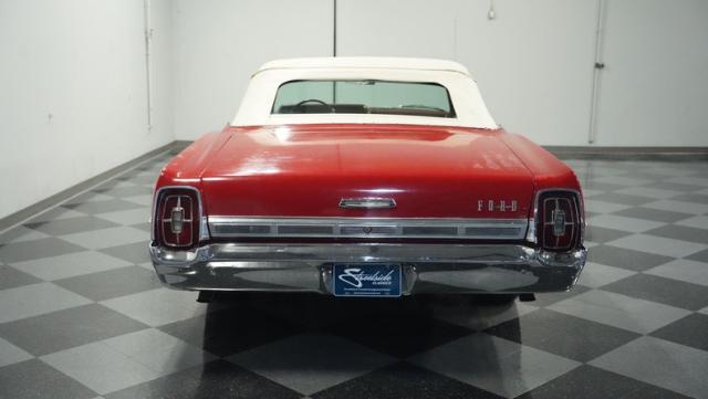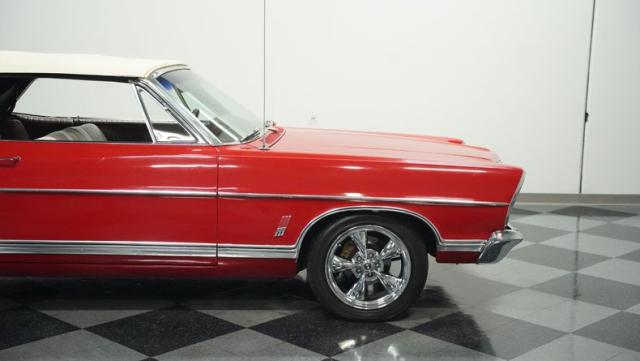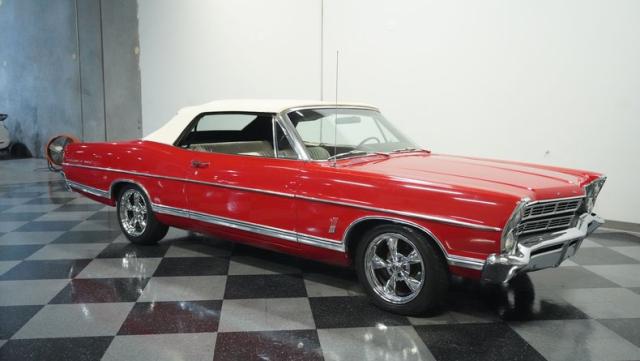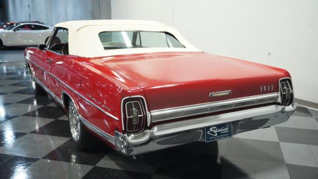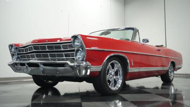 This 1967 Ford Galaxie 500 Convertible commands respect with its Candy Apple Red finish. The sleek body stretches 17 feet long, showcasing the era when American cars ruled the road. Chrome accents highlight the Galaxie\'s muscular lines, from the bold front grille to the sculpted rear panels. The white convertible top provides a sharp contrast, folding away to reveal the open sky. Rolling on 17\" wheels wrapped in beefy 225/55ZR17 tires, this Galaxie combines classic style with modern road grip. Dual exhaust tips peek out from the rear, hinting at the power of the 390 V8 engine.