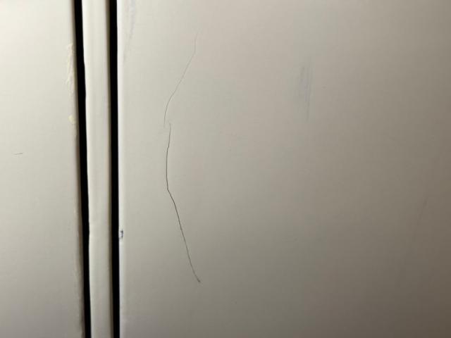 Regardless of the number of doors, the wedge trim on the 1957\'s remains a top 5 iconic all time automotive design element. On the 4 door, part of the wedge is on the back doors and therefore contain a seam, but still serves as a great way to introduce the rear fins which rise above them like Batman\'s ears. The bottom line of the wedge travels as a mid line trim piece all the way to the front where it ends in a spear under the fender louvers, a Bel Air cue. The chrome and metal trim are in great shape including the floating headlights, the twin rocket hood ornaments, and the hefty bumpers and grille. 14-inch polished Chevrolet Rally wheels could use some help and the side mirror is missing. Other imperfections include various cracks in the paint, areas of surface rust where paint is missing, bubbling, chips, and a section of the front bumper that is rusty and peeling.