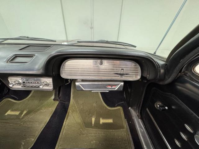 A swing of the driver\'s door reveals a clean utilitarian no frills interior even though we are in the middle trim line Corvair offered up for the time. Door panels are solid black vinyl with various panels in smooth and horizontal and vertical stitched ribbed centers, a black armrest, and shiny actuator and window crank. Some horizontal trimmings break up the different black vinyl panels, and polished buttons adorn the stitch crossings. 2 large black vinyl buckets in good condition stretch across the front, and a large bench is shoehorned into the rear of the car. The buckets have some tuck and roll inserts and smooth bolsters, as does the rear bench. The shifter resides in front and to the right of the driver on the full metal jacket dash in mostly original condition. It shows in a black steel dual eyebrow padded dash top with the brushed stainless instrument panel with a wide speedometer for this Monza edition. On the passenger side is a stainless glove box door under the second black steel eyebrow. Dash central holds an upgraded AM/FM radio done by Mike Hagen to keep you abreast of the latest in music. Deep pile nicely preserved black carpeting covers the floors and shows with minor soiling and fading. What a great well preserved interior.