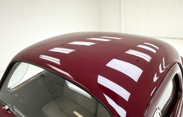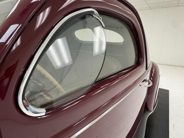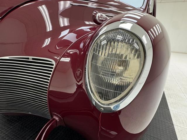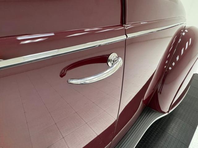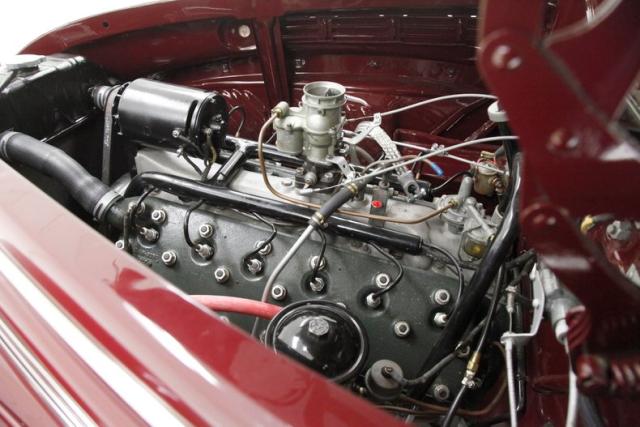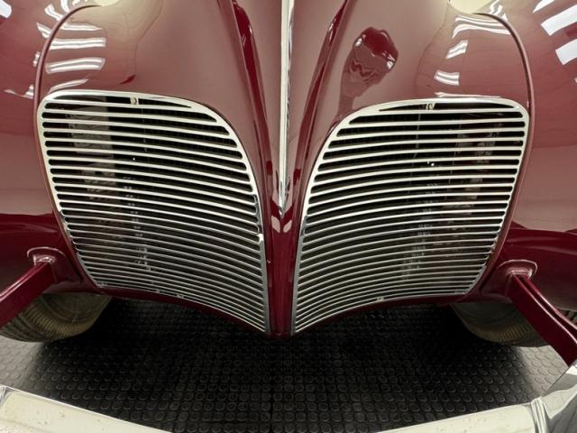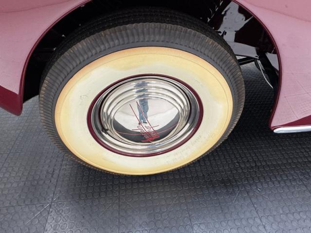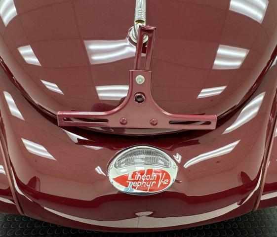 Burgundy paint bathes the exterior panels and it\'shard to find a single fault in the finish. Wonderfully formed steel curves abound on this car, and with a minimal use of brightwork, one can truly appreciate and breathe in the luxurious lines of the body. Mirror polished bumpers with their bumperettes, headlight bezels, handles and mirrors are all excellently restored with no dimpling or rusting. From its horizontally ribbed V-shape grille to the semi sunken headlights this car screams streamline. For your history lesson of the day:Complaints about the \'36 and \'37 Zephyr\'s tendency to overheat were pouring in to Ford. So according to an interview with Gregoire, he measured the space between the front frame rails, and decided that the radiator would just fit between them, if mounted horizontally, (cross-flow), and quickly had it cobbled up, along with cut-outs on both sides of the front sheet metal. A quick run in a crude air-tunnel proved its effectiveness, so \"Bob\" Gregoire designed the delicately ribbed grille over the openings. Voil; the first modern horizontally-oriented grille. So much so that rumor has itGM Styling Head Harley Earl was quoted as saying: \"Oh my God, how did we miss on that one? That\'s going to ruin us\". Nicerunning boards with excellent rubber connect the curvaceous fenders and just above the true teardrop shape of the passenger compartment of the body, which is amplified by the rounded doors. Beautiful rear fender skirts continue with the teardrop design and highlight the rear fender design nicely. Teardrop style tail lights are mounted into the pointed trailing edges of the rear fenders and frame a swooping trunk lid with another flawless bumper below. Period correct and nearly new Firestone wide white wall rubber wraps 16\" steel wheels which are adorned by simple dog dish style caps with the Lincoln-Zephyr logo within.