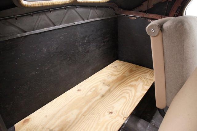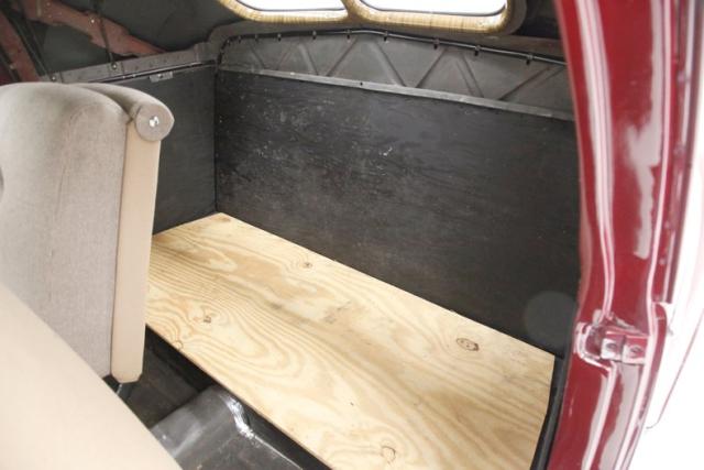 A swing of either of the 2 doors and we see the bare steel shell and inner workings of the doors. These doors, as well as the rear sides are missing their panels, but we do note fully refinished zebra grain wood applique covered window frames. As we move inside, a couchlike bench seat within its own stylized tub, is all covered in tan broadcloth with a slight tuck and roll pattern with a few buttons sprawls across the front of the cabin. This bench is like new and has no wear or tears to speak of. The rear of the car is unfinished with a mix of black painted and natural finish plywood providing the base for whatever you\'d like to install. Stamped sheet metal, finished in black and all rust free floats this interior and peering upward we see the underside of the roof in bare steel, so you can add those items to your to do list. Lest we forget the highlight of the interior which is an art deco styled dash. Grayish taupe painted steel, twin gloveboxes, and a centrally located chrome bezel white face gauges with black type flanks the factory AM radio on the left, ashtray on the right, and the factory clock below all with matching more art deco styling. An original and fully restored large cream rimmed banjo style steering wheel fronts this beautiful dash.