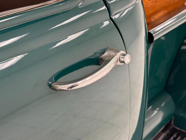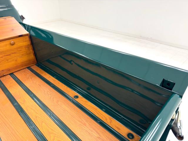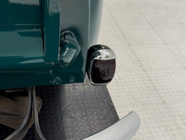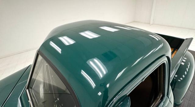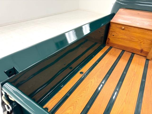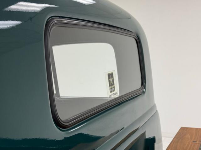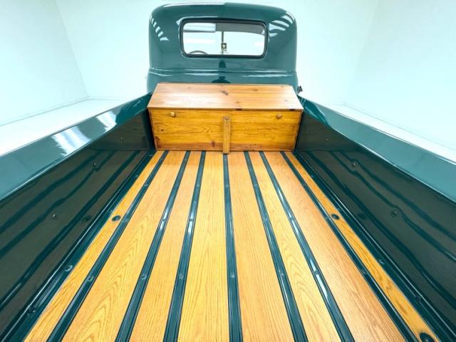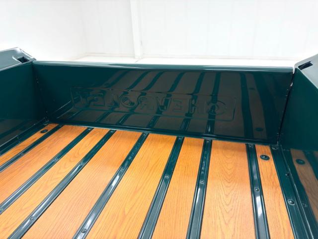 Seacrest Green, here in single stage, is both period correct and quintessentially American classic and when combined with oak planks in the bed, it just looks right. There\'s also a wood trunk in the bed and notably, the rails are painted green on the bed to solidify the contrasting palette. Chevrolet is emblazoned in white on the tailgate while the tail lights are smoked in appearance above a straight, chrome bumper. Up front, the grille is monochromatically green which makes the red Chevrolet badge pop, along with the headlight rings, clear lens marker lights, and bumper. Fantastic red graphics adorn the hubcaps on the black steel 16-inch wheels wrapped with Tornel tires. The exterior is very clean and we could not find any imperfections.