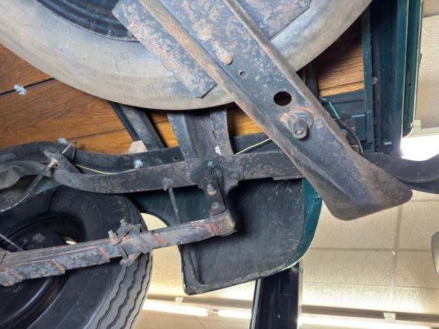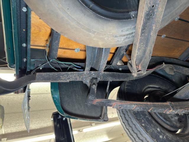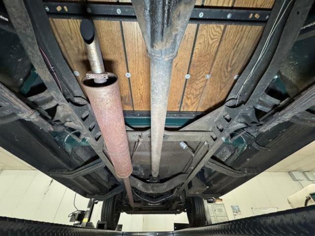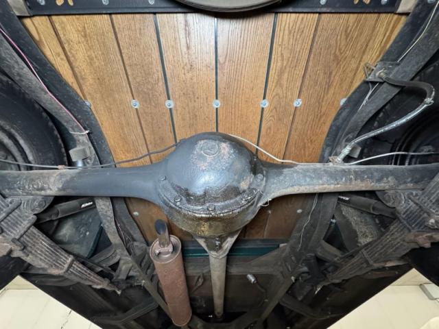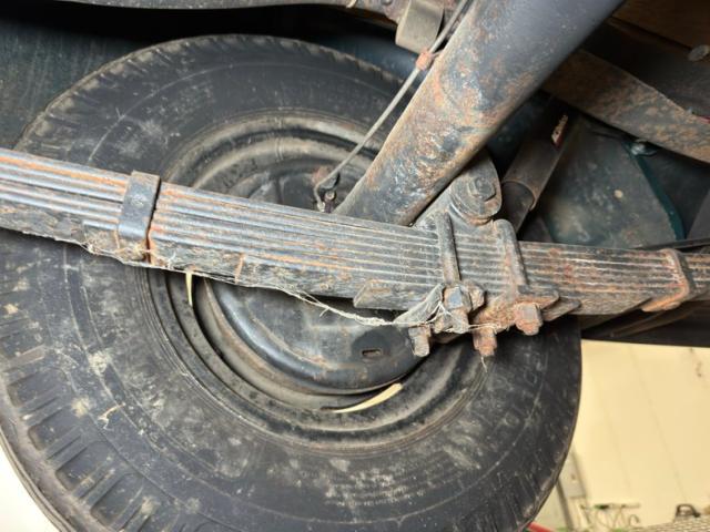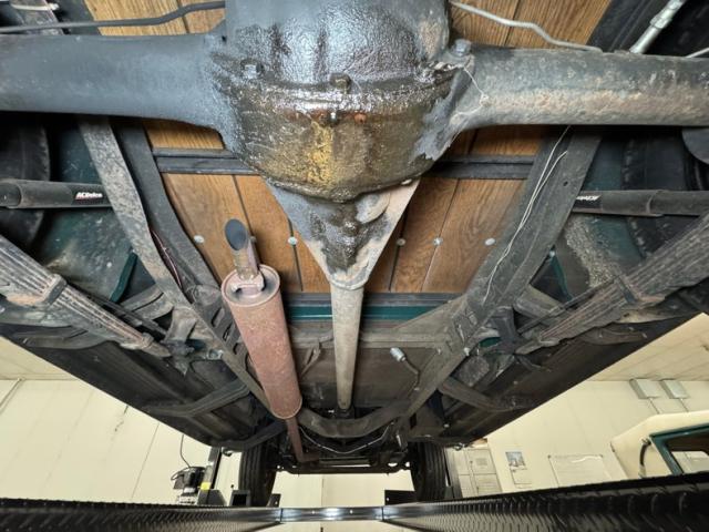 Driver quality underneath with typical surface rust, oil on the pans and rear differential, some gunk and road dirt about, in other words, wonderfully original!. There\'s oil present on the left side of the engine and it made its way onto the leaf springs and frame on that side. Drum brakes are at all four wheels and a single exhaust runs through a stock style muffler and dumps under the bed, as originally found. Those leaf springs in the front are matched by a pair in the back.