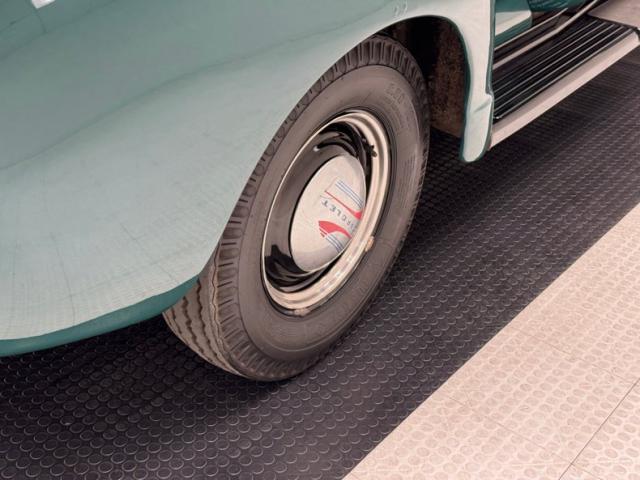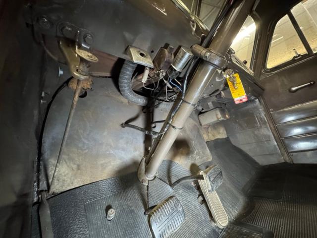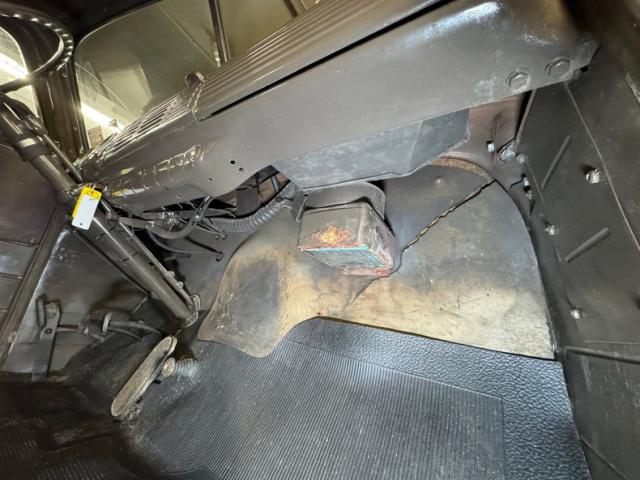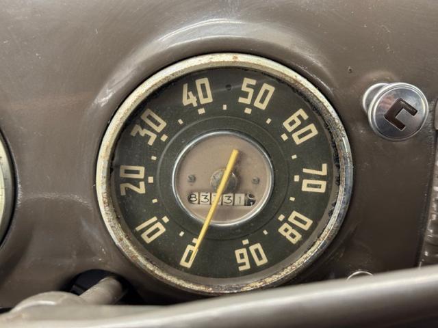 Brown upper panels on taupe painted inner doors have just the right amount of patina and we wouldn\'t touch a thing. Inside, a simple brown vinyl bench seat is in fine shape and faces the patina rich steering wheel, looking very original and fronting the classic dash with original gauges and the paint that surrounds them and runs the width is very nice. Plenty of patina on the firewall too but the floor is coated in a textured rubber mat, all under a soft headliner that shows its age.