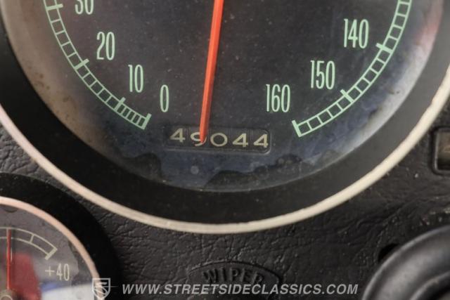 Inside, the black vinyl interior presents a vibrant contrast to the red exterior. The cockpit features black bucket seats, a floor-mounted shifter, and a center console that epitomizes the sports car ethos of the era. A factory AM/FM Delco radio and a factory clock maintain the period-correct ambiance. The padded dash houses stock gauges, providing all the essential information at a glance.