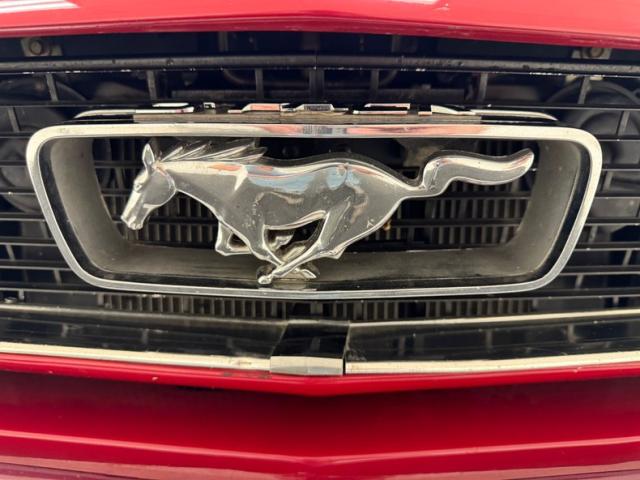 Red door panels, in deluxe configuration, are in great shape and each features a ribbed insert and courtesy light. Inside, red bucket seats are augmented by the wild Mustang herd stamped into the saddle trim piece and this also appears on the rear 2+2 seats. Other than a small hole in the grain vinyl of the driver\'s seat, all present in clean condition. The wood rimmed steering wheel matches the instrument cluster faceplate where a combination of stock and aftermarket gauges appear, joined by an added triple pod under the dash. Along with the dash pad and wood faced glove box, it\'s all in nice condition, a grade that continues to the center console where the white knobbed shifter rises to the task at hand and cupholders have been added for that modern touch. Our red carpet below is in fine shape and includes Mustang branded mats, while the trunk houses the battery box, a vinyl floor covering, and the red tonneau for the soft top.